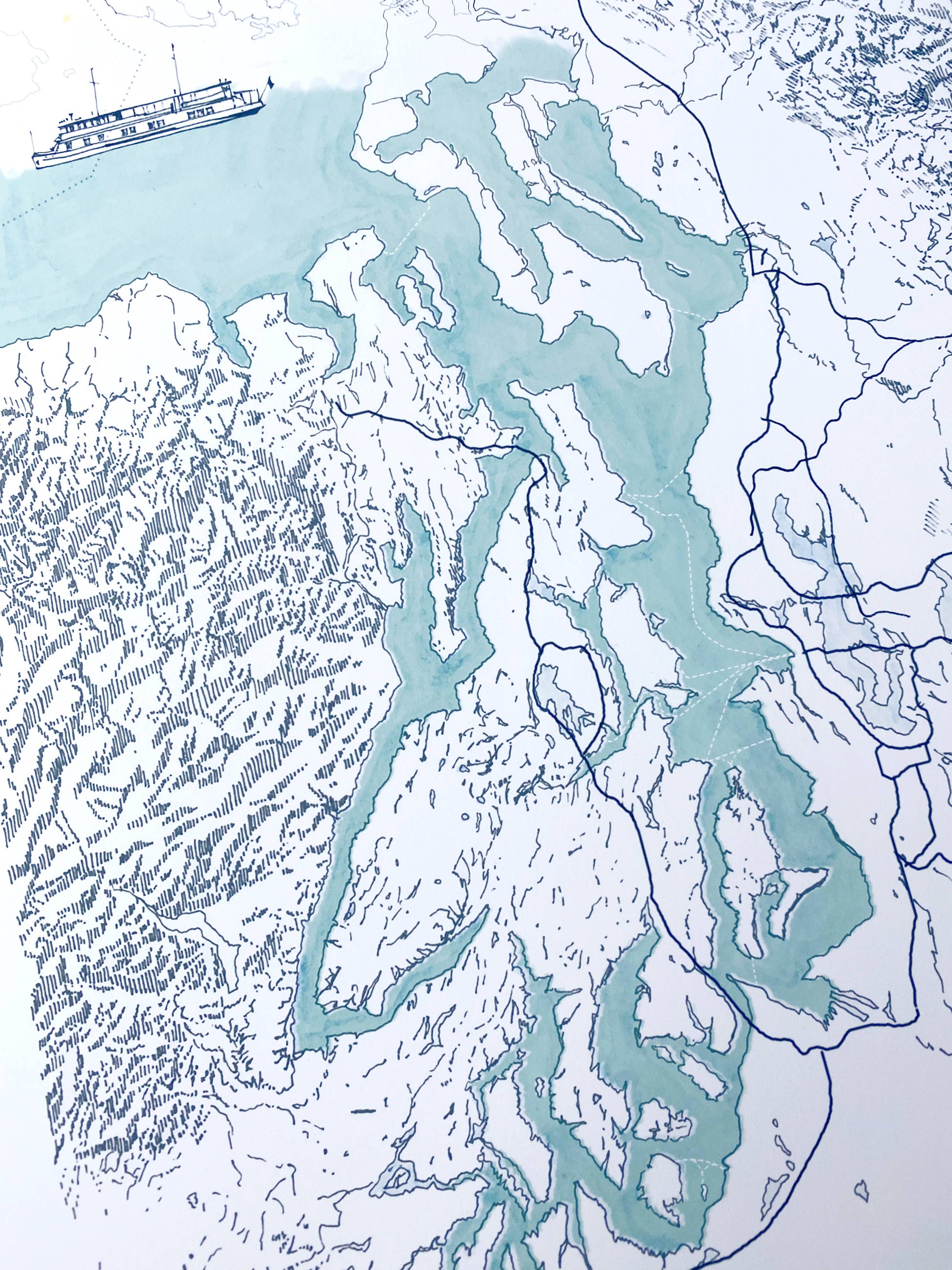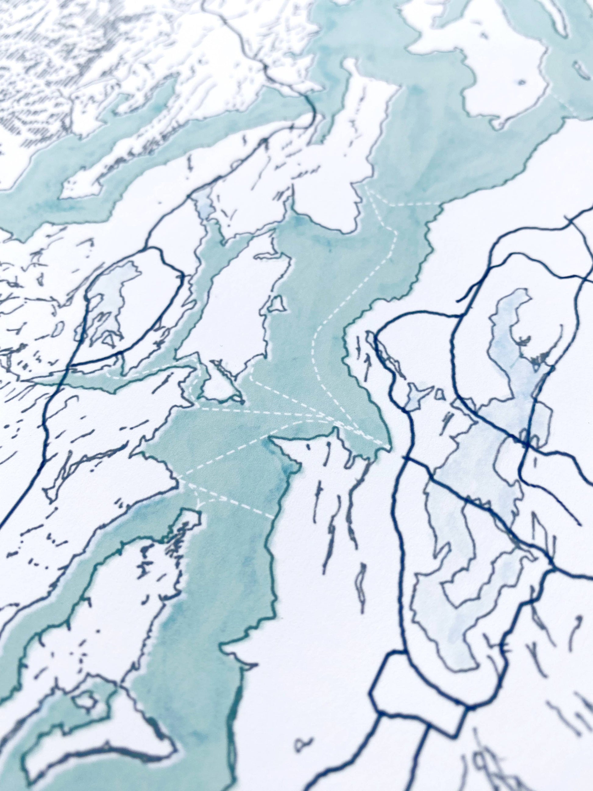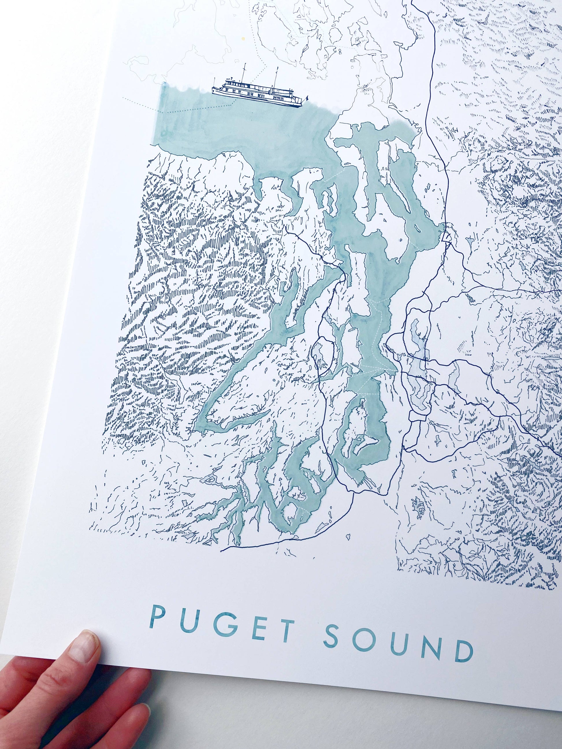 My hand-drawn Map depicts the Puget Sound, its coastlines, boundaries and islands, ferry routes, and surrounding topography. This is a 13" x 19" Print.