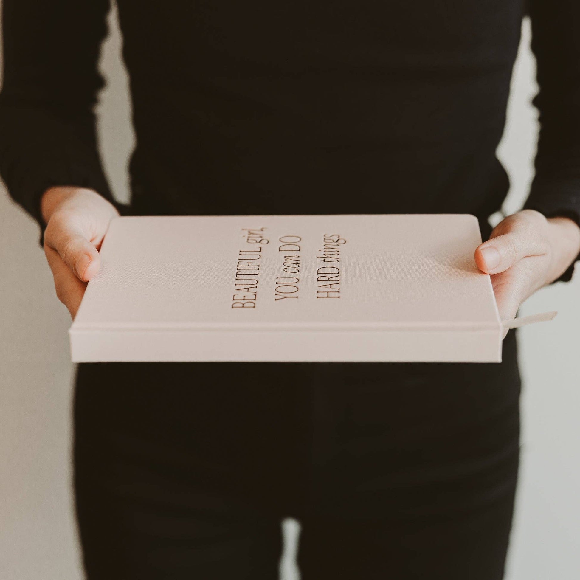 Attend your next meeting or class with a reminder that you are capable of anything. This stunning light pink journal features gold foil accents and 100 pages ready to be filled with your important notes, thoughts, and dreams.
