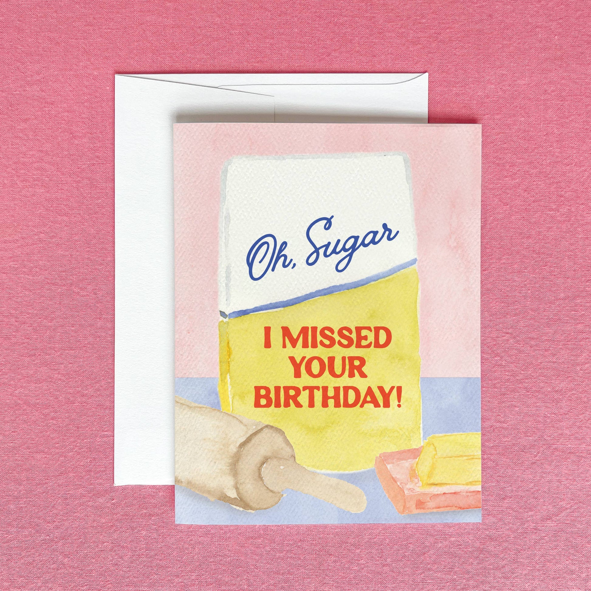 The perfect card if you missed someone’s birthday but still want to send a thoughtful note. This belated birthday card features a hand-painted illustration of a bag of sugar and the phrase “Oh Sugar, I missed your birthday!” It’s a light and playful way to say sorry—without skipping the sweetness.