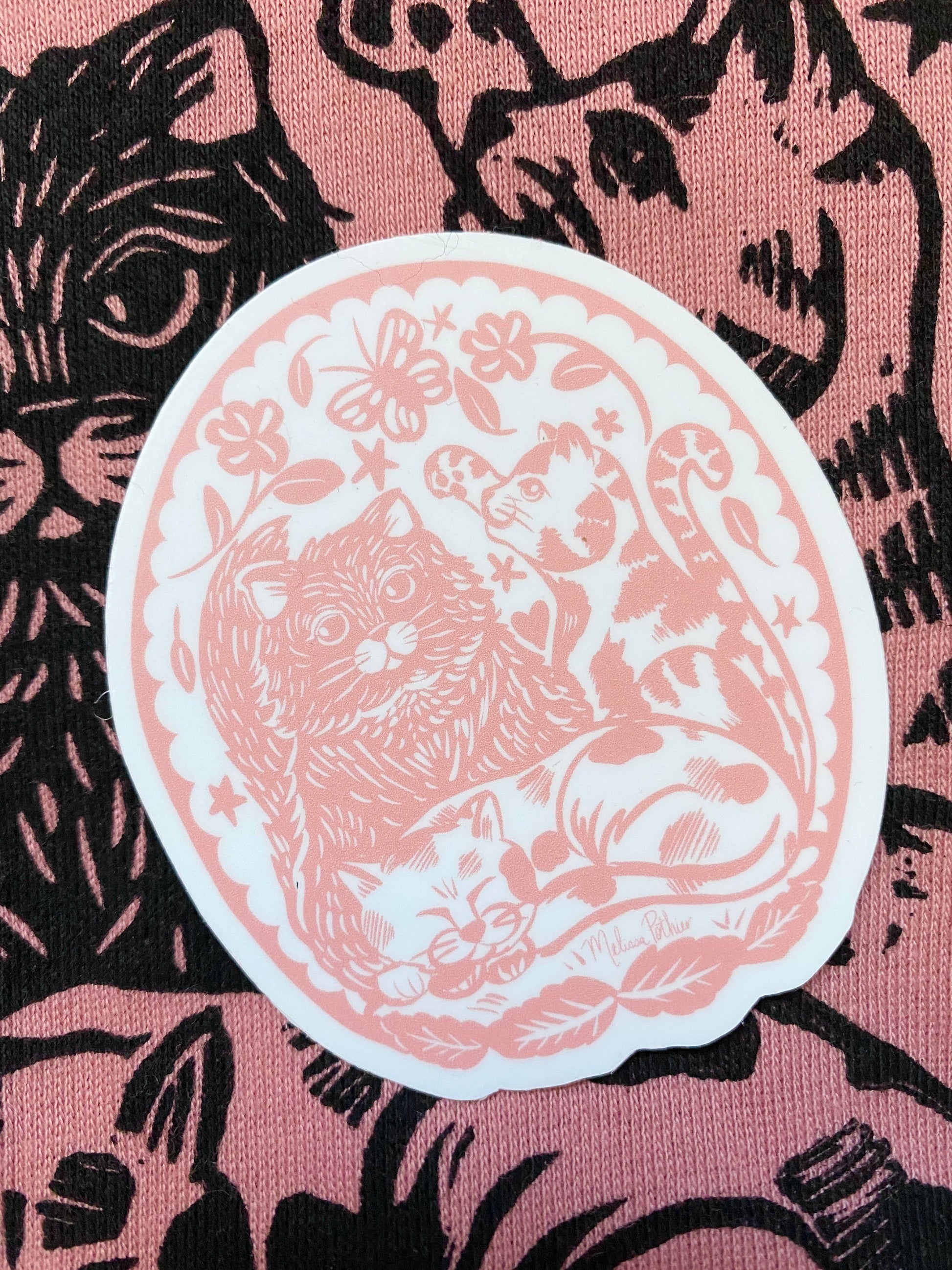 A trio of sweet cats are featured in this cute vinyl sticker. A fluffy kitty, calico cat, and stripe tabby snuggle together in a scalloped frame in a pretty light pink.