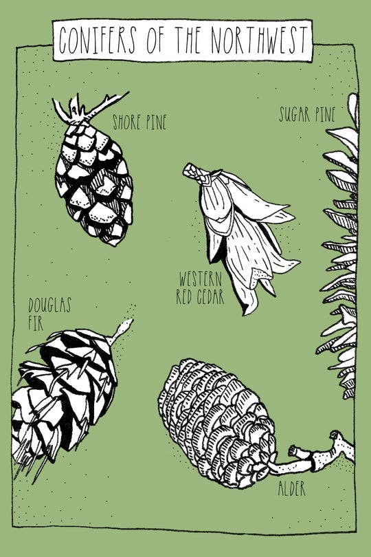 Send more mail! Here is a cute 4x6" postcard featuring illustrations of conifers.