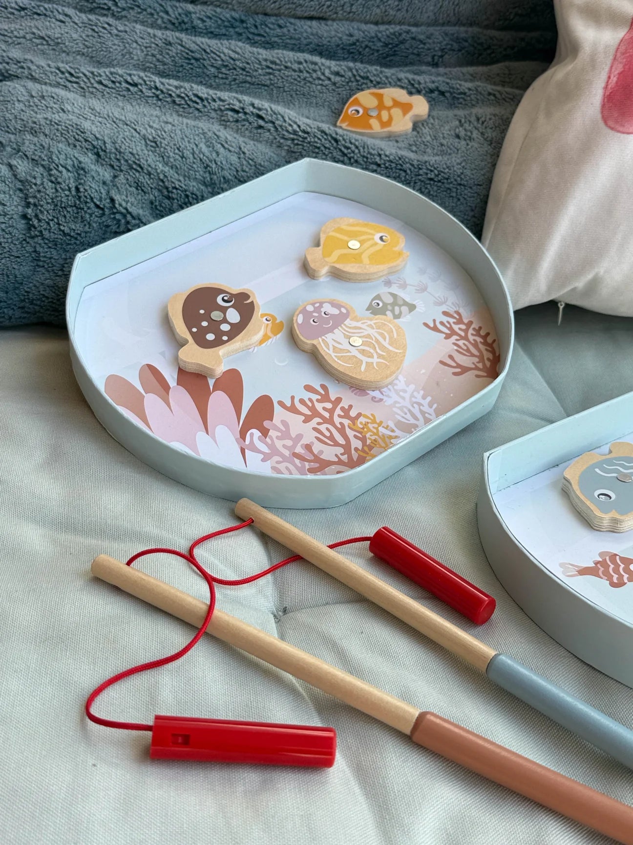 Time to go fishing. Grab your fishing rod for a fun time! These colorful wooden fish can be hooked up by the magnetic rod, and once safely attached, lowered back onto the wooden board.