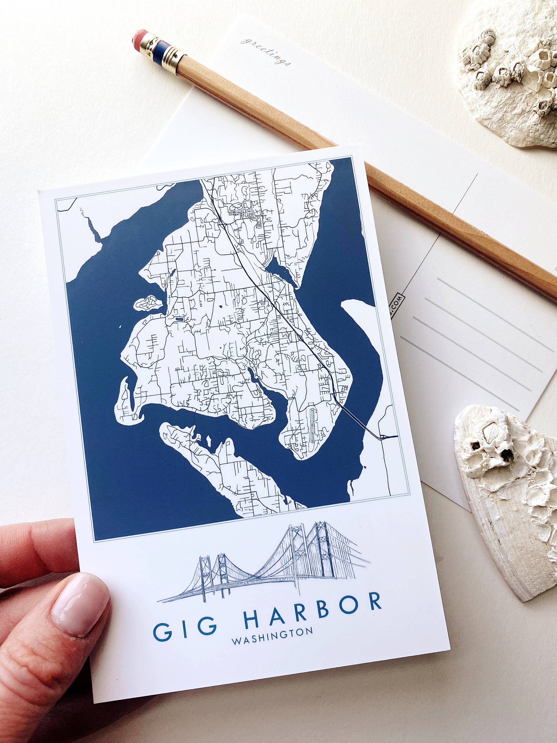 My GIG HARBOR WA Hand-drawn "Blueprint" Map, now on a Postcard - Show some local love for your favorite peninsula harbor town!