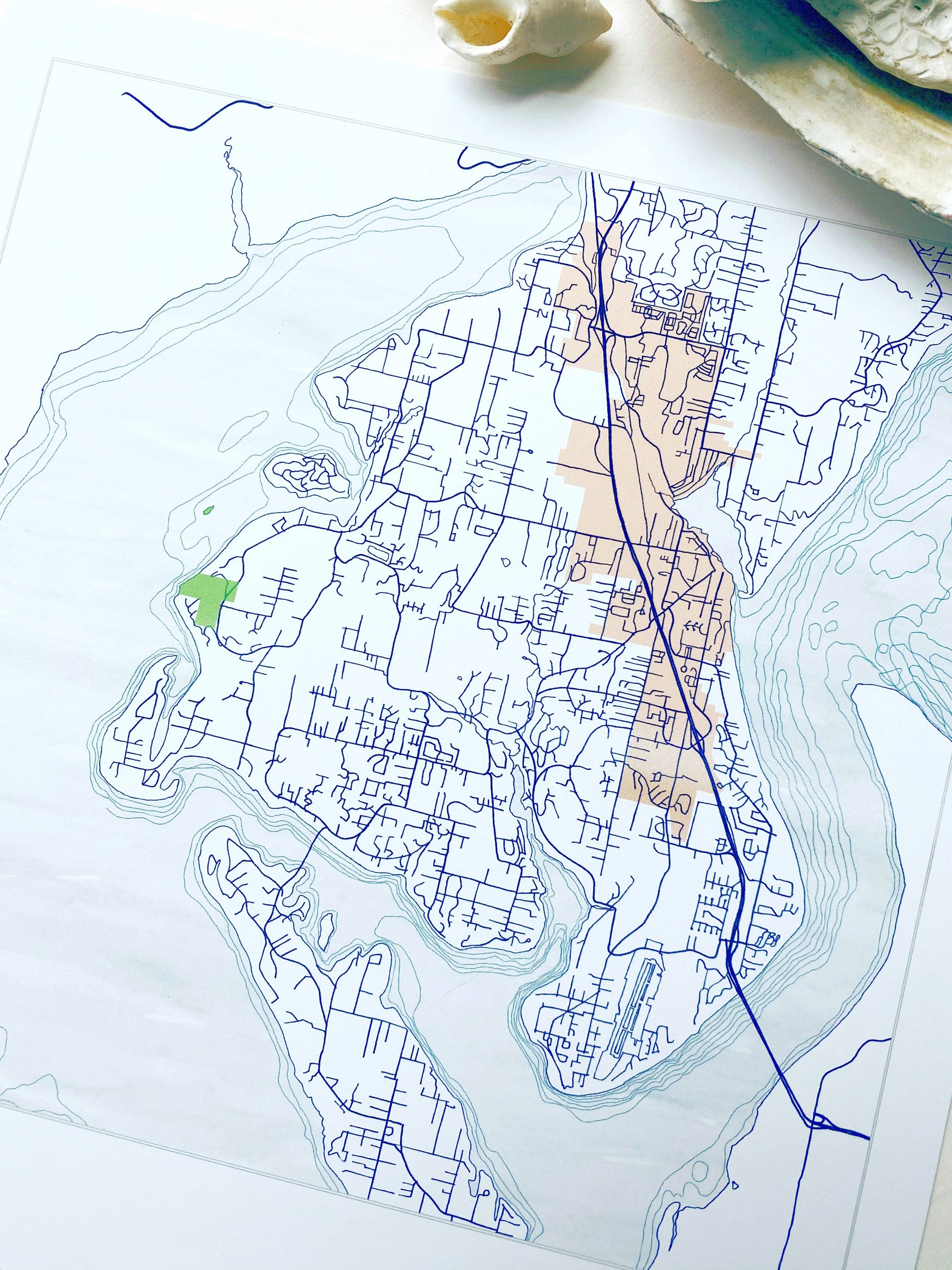 This is a PRINT of my original hand-drawn dark blue ink line drawing with just a touch of color to highlight the town limits and the State Park. A pale blue watercolor complements the bathymetric lines on the Sound.