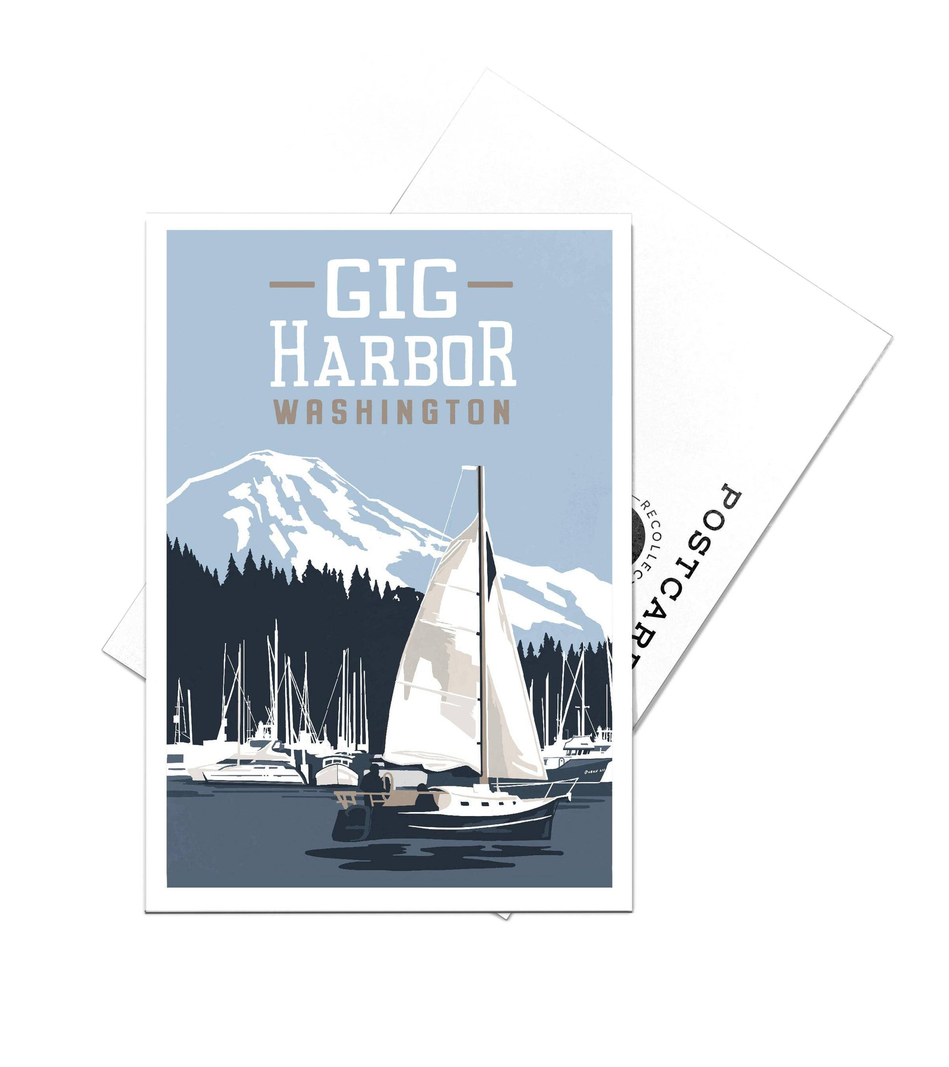 Postcards of the Gig Harbor, Washington Travel Poster Design printed on beautiful matte paper. Available for wholesale orders only.