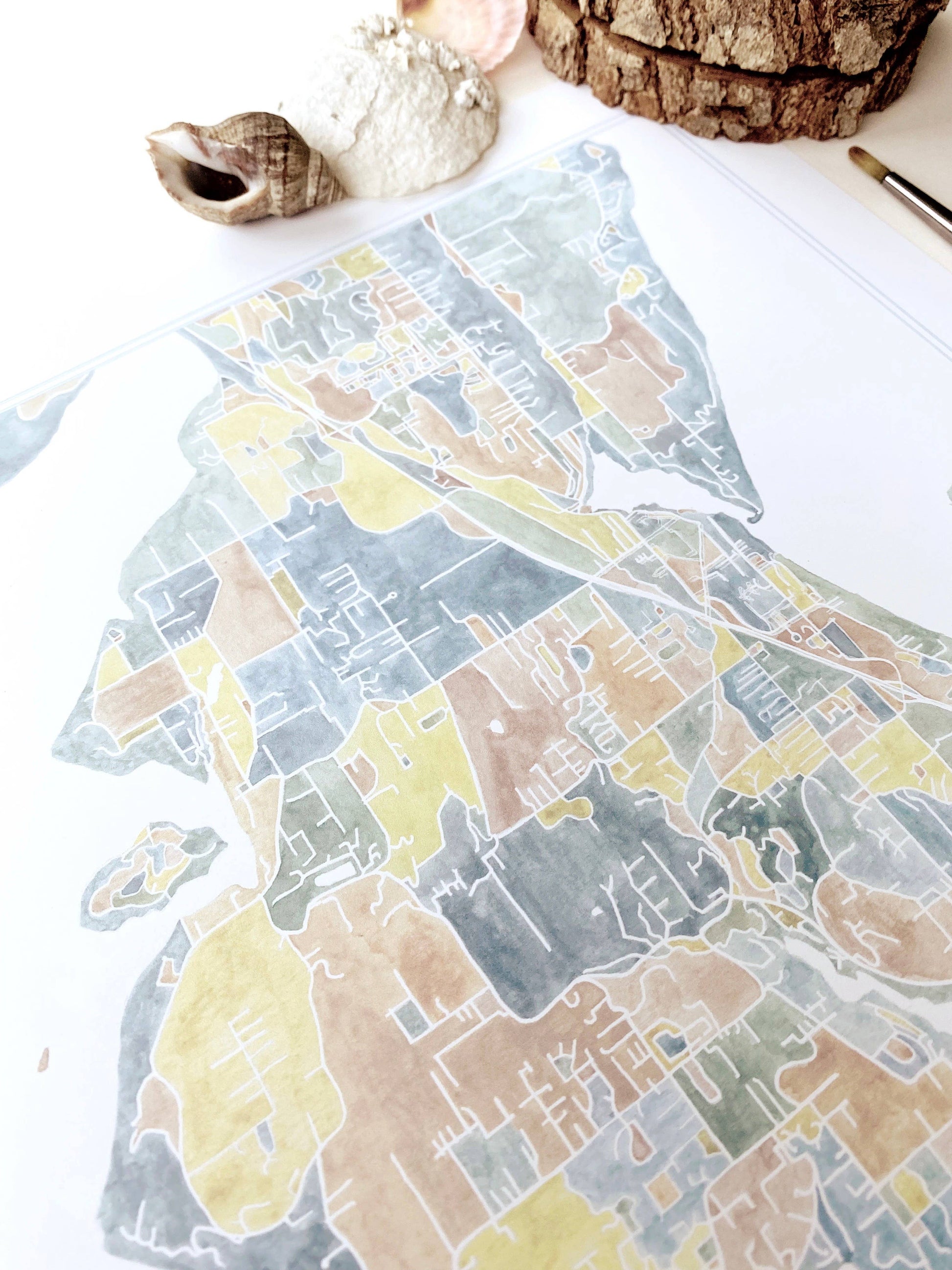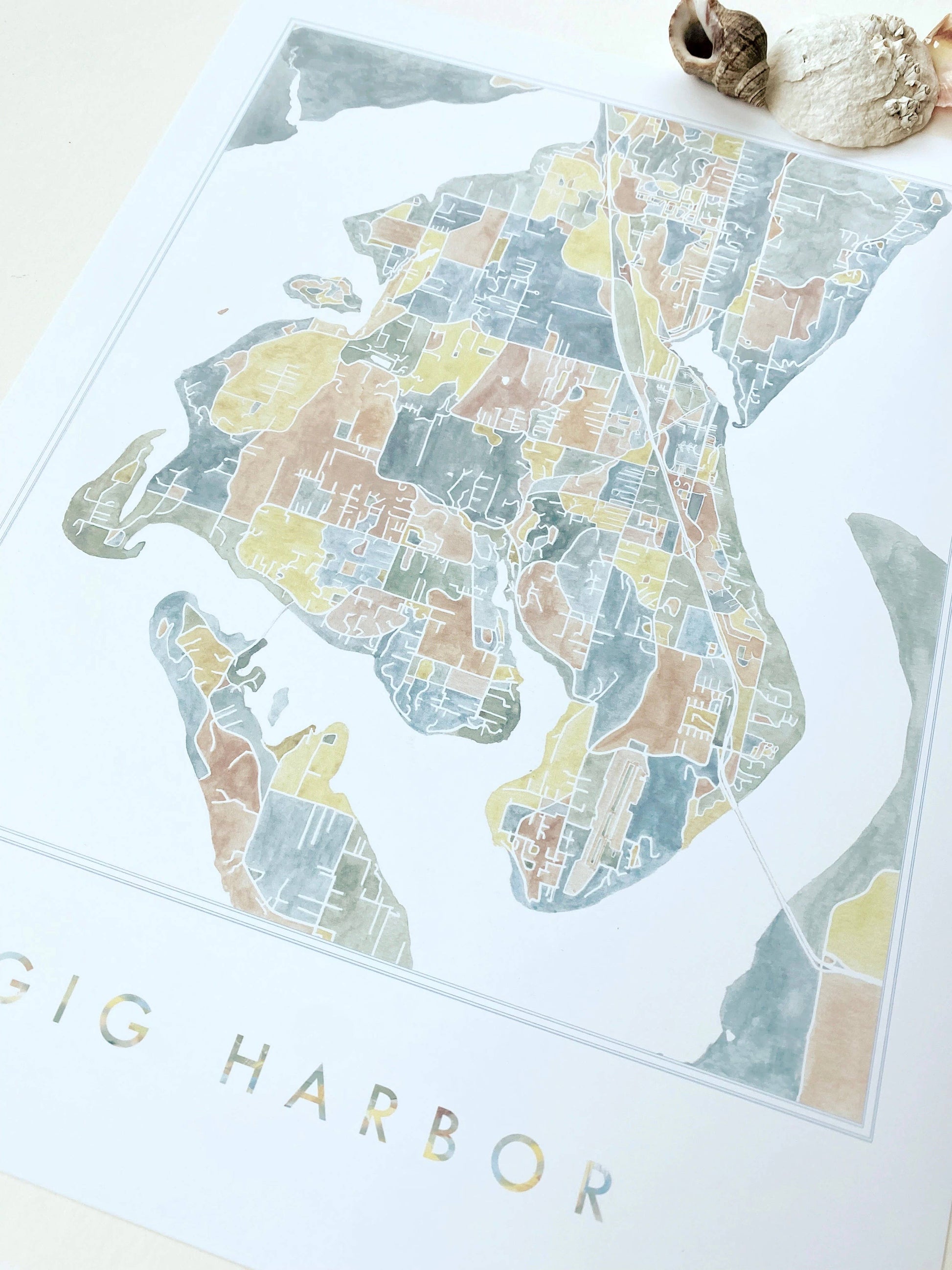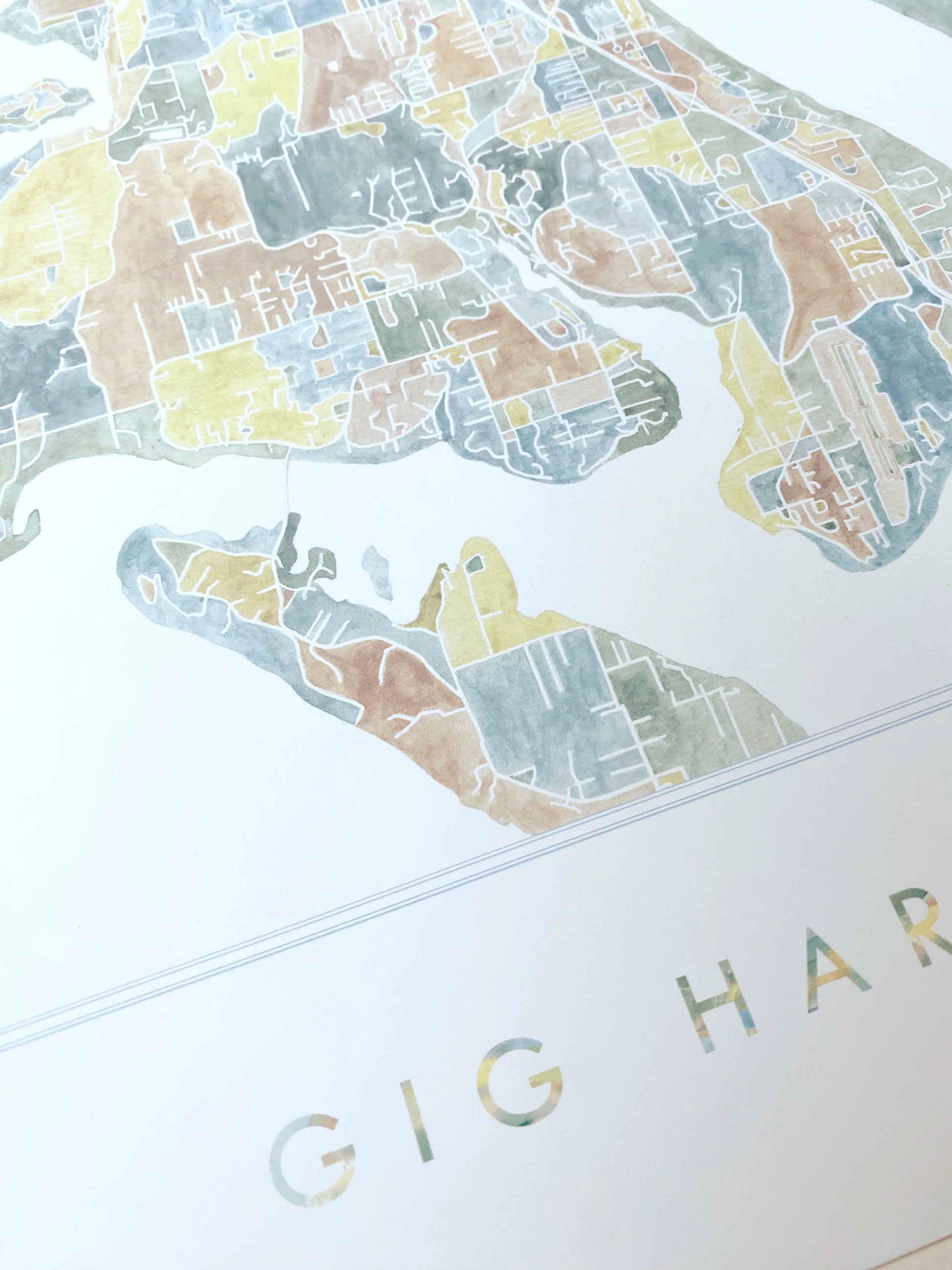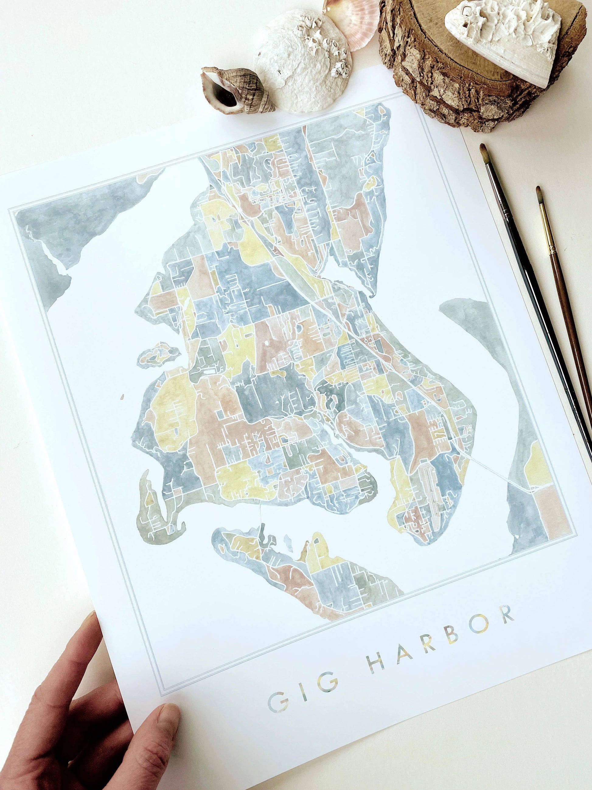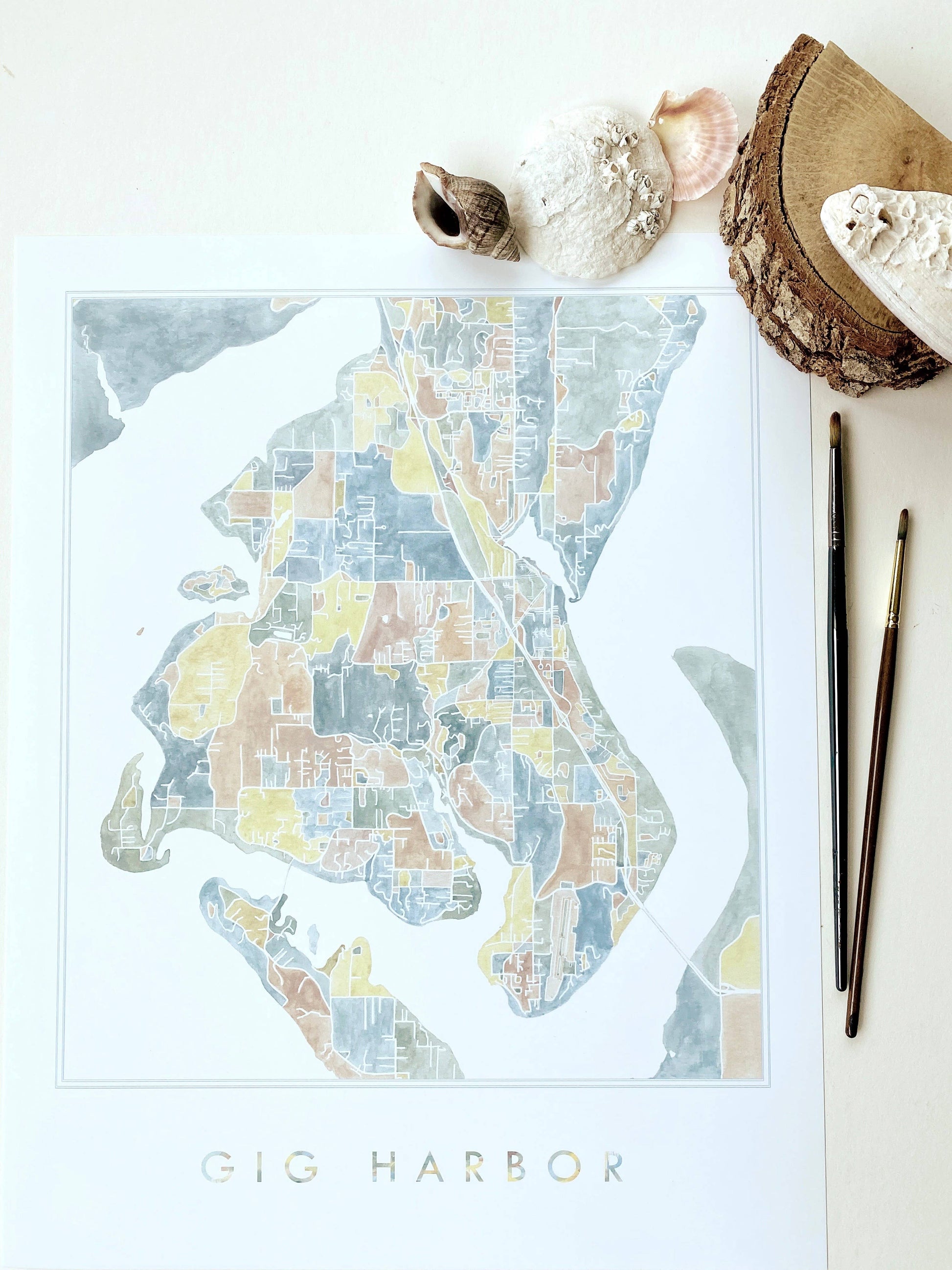 GIG HARBOR, Washington Hand-painted Watercolor Map Art Prints - Show some local love for your favorite town!