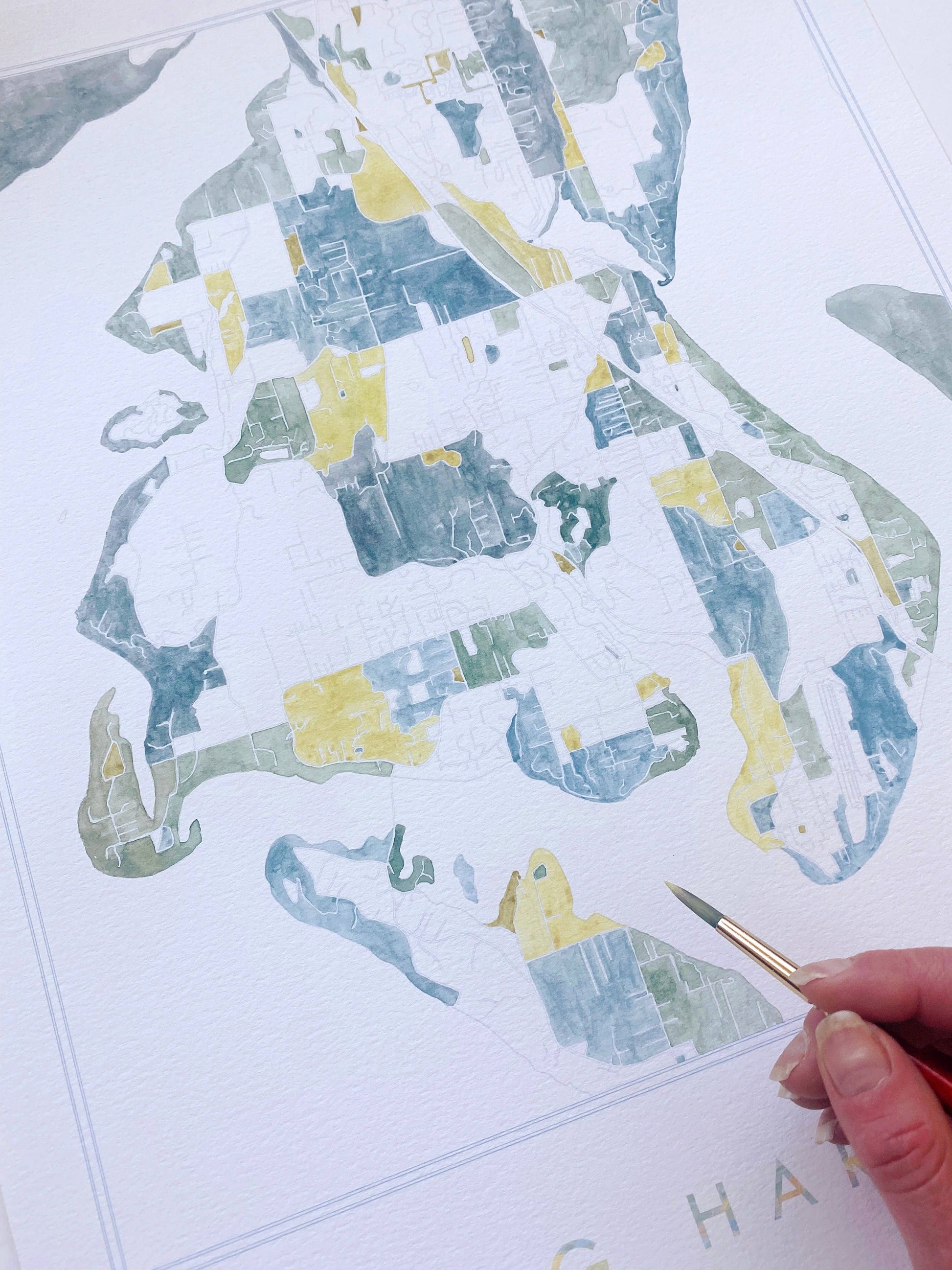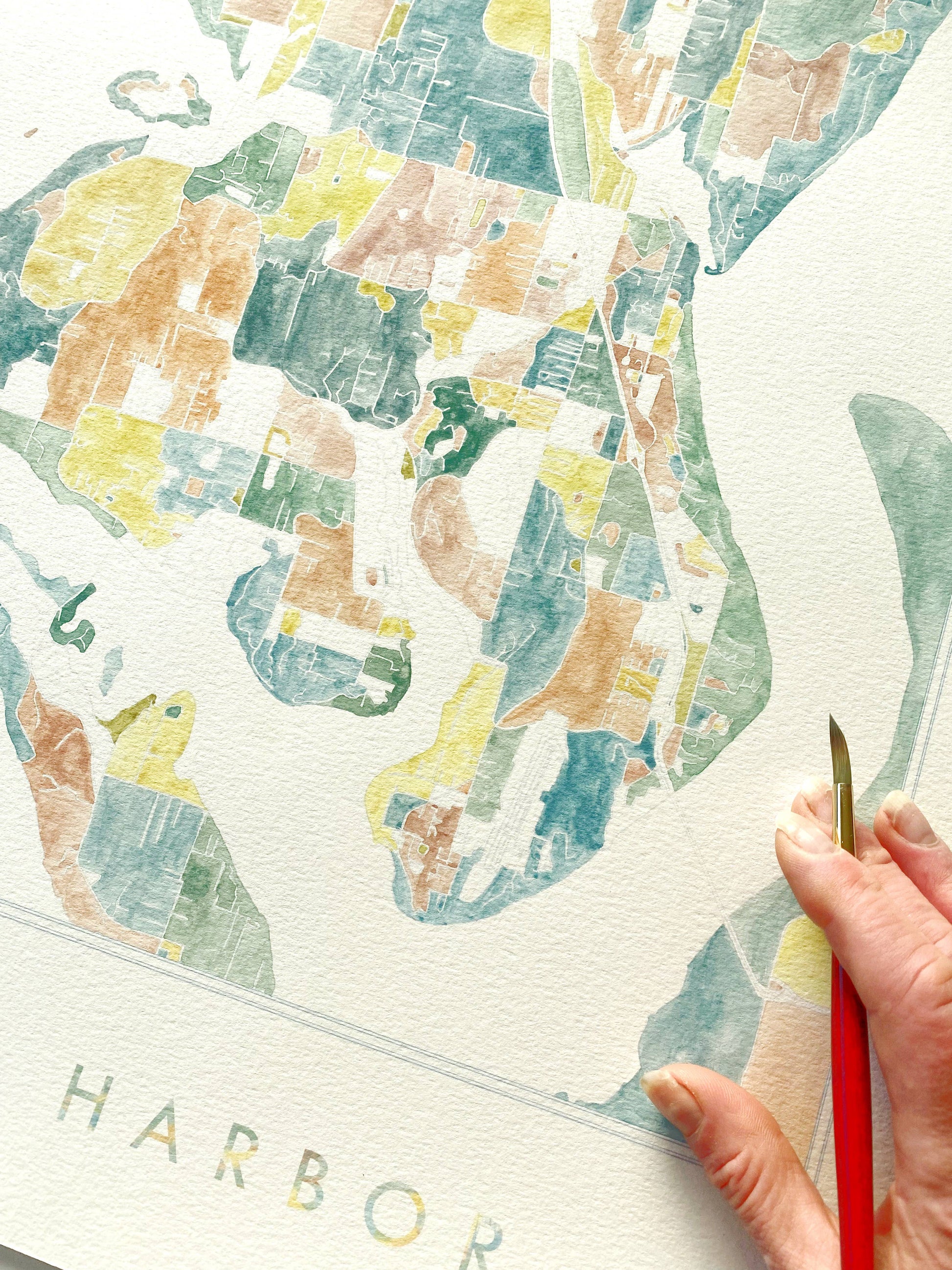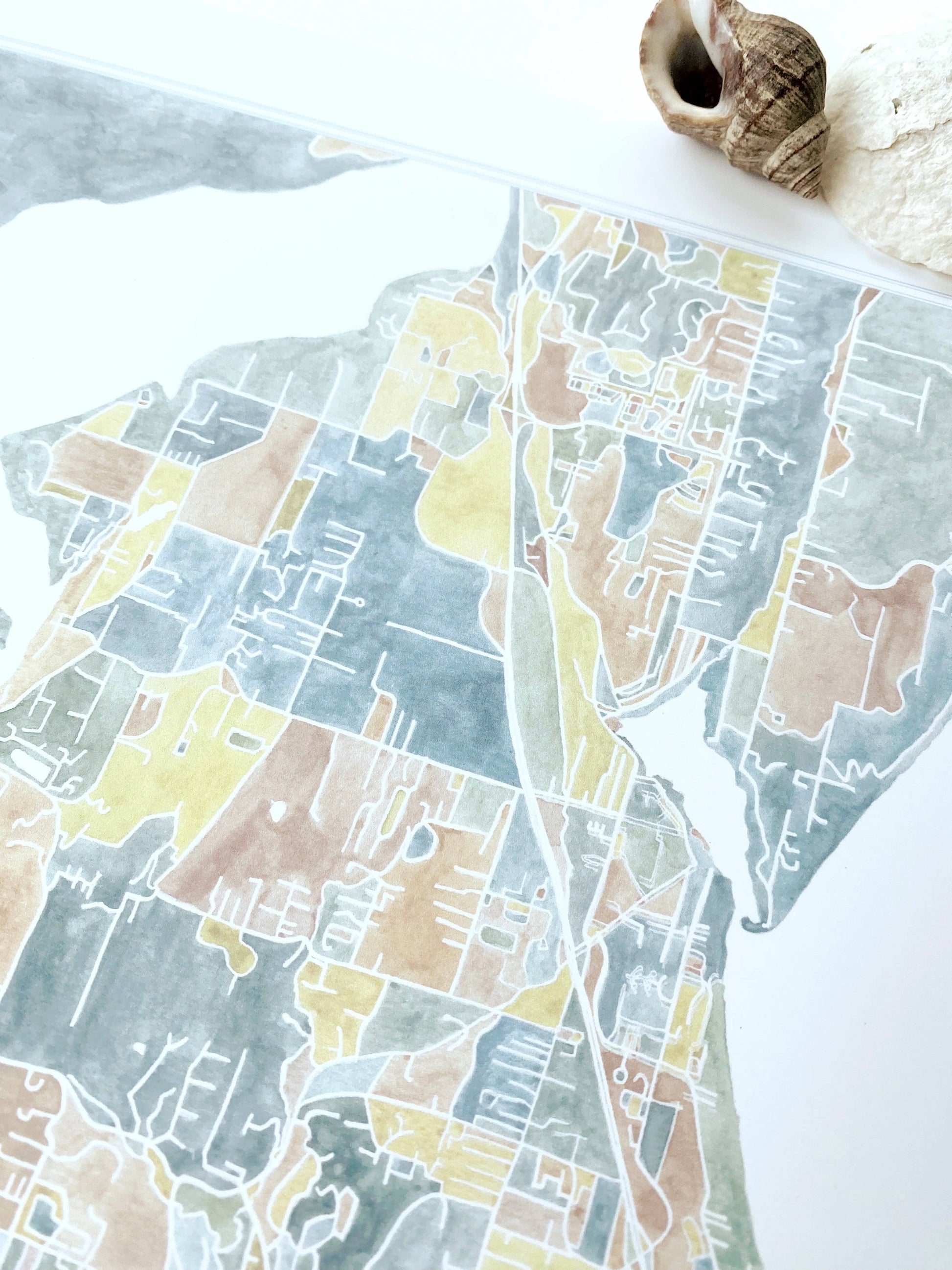 This is a PRINT of my original hand-painted watercolor map in variegated tones of blue, green, yellow, rose and burnt orange - pale and calming, complements a nautical or minimal decor. Each "block" watercolored by hand.