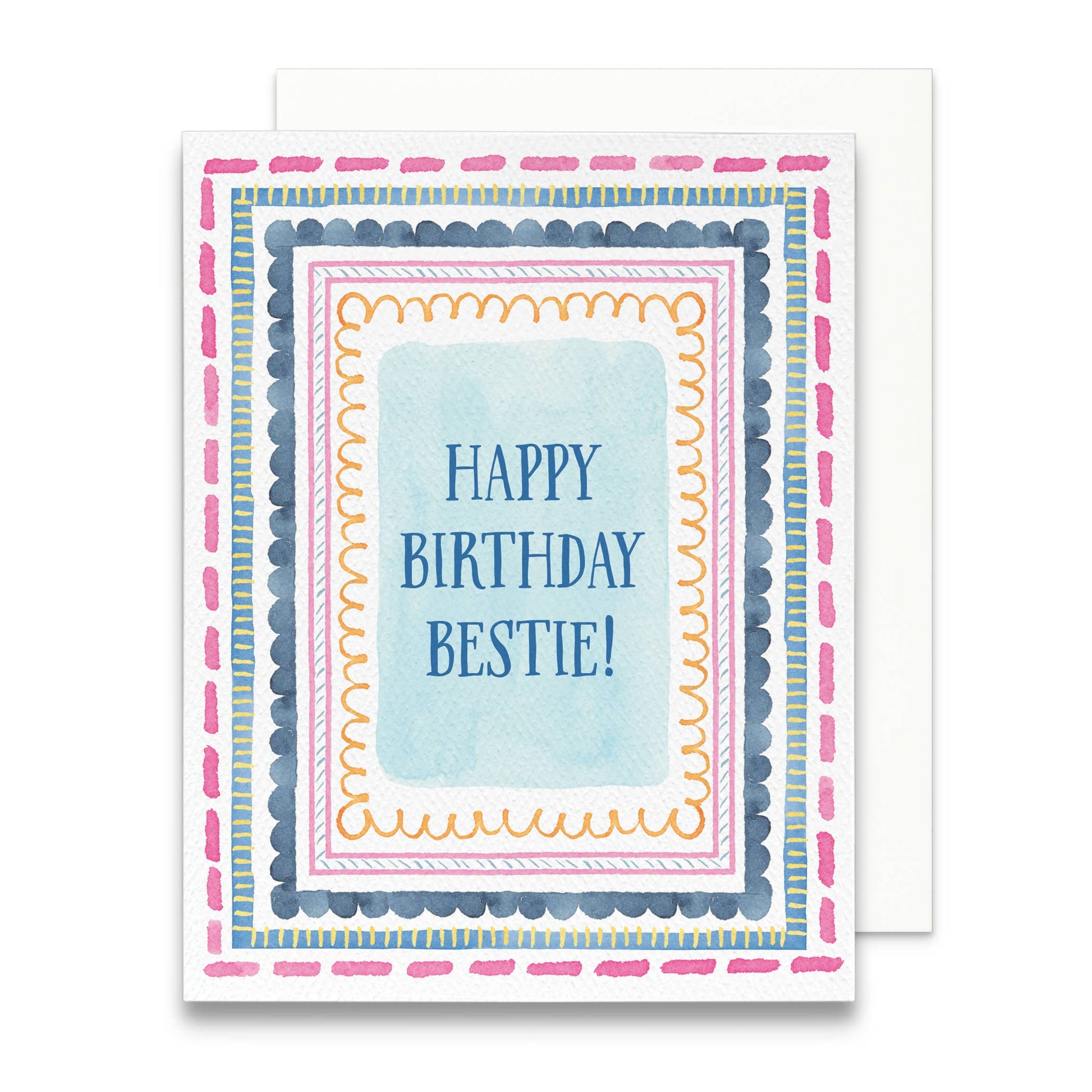 A fun, colorful way to celebrate your best friend! This birthday card features hand-painted, whimsical watercolor borders framing the phrase “happy birthday bestie” in blue lettering. Designed from an original watercolor painting, it’s the perfect mix of playful and fun—just like your friendship.