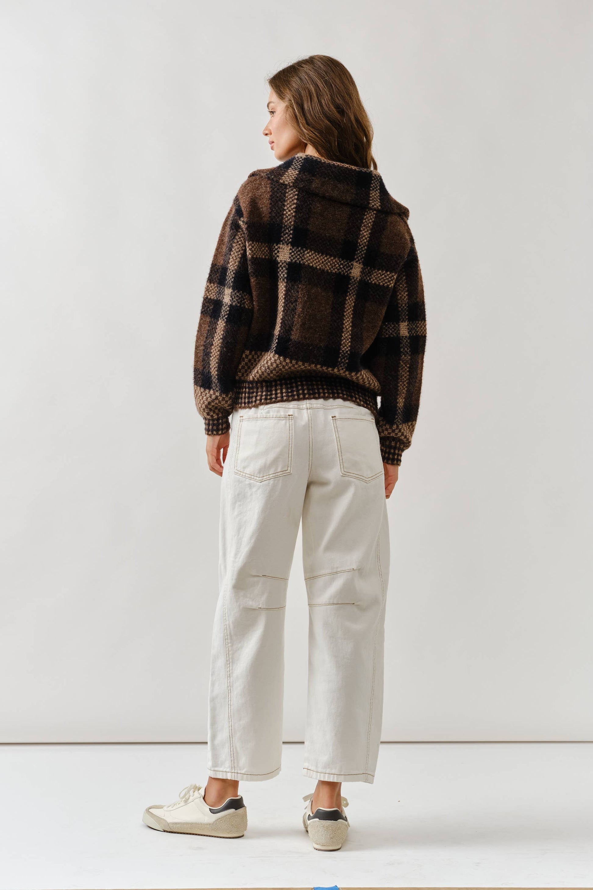 Featuring a soft, brushed texture. this piece adds a warm and vintage-inspired touch to any outfit. Designed with a wide collar, front button closure, and checkered ribbed hem and cuffs for added charm.