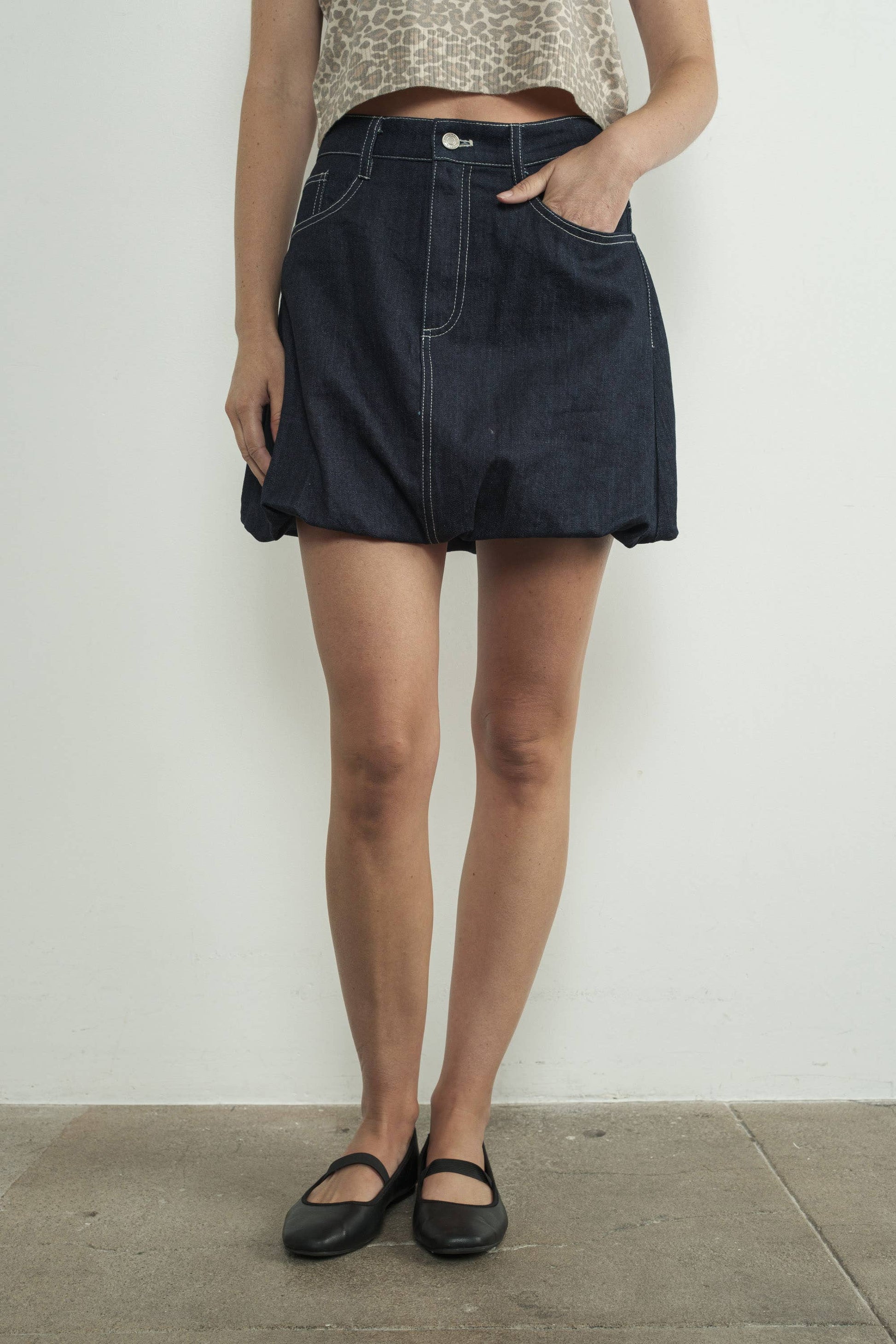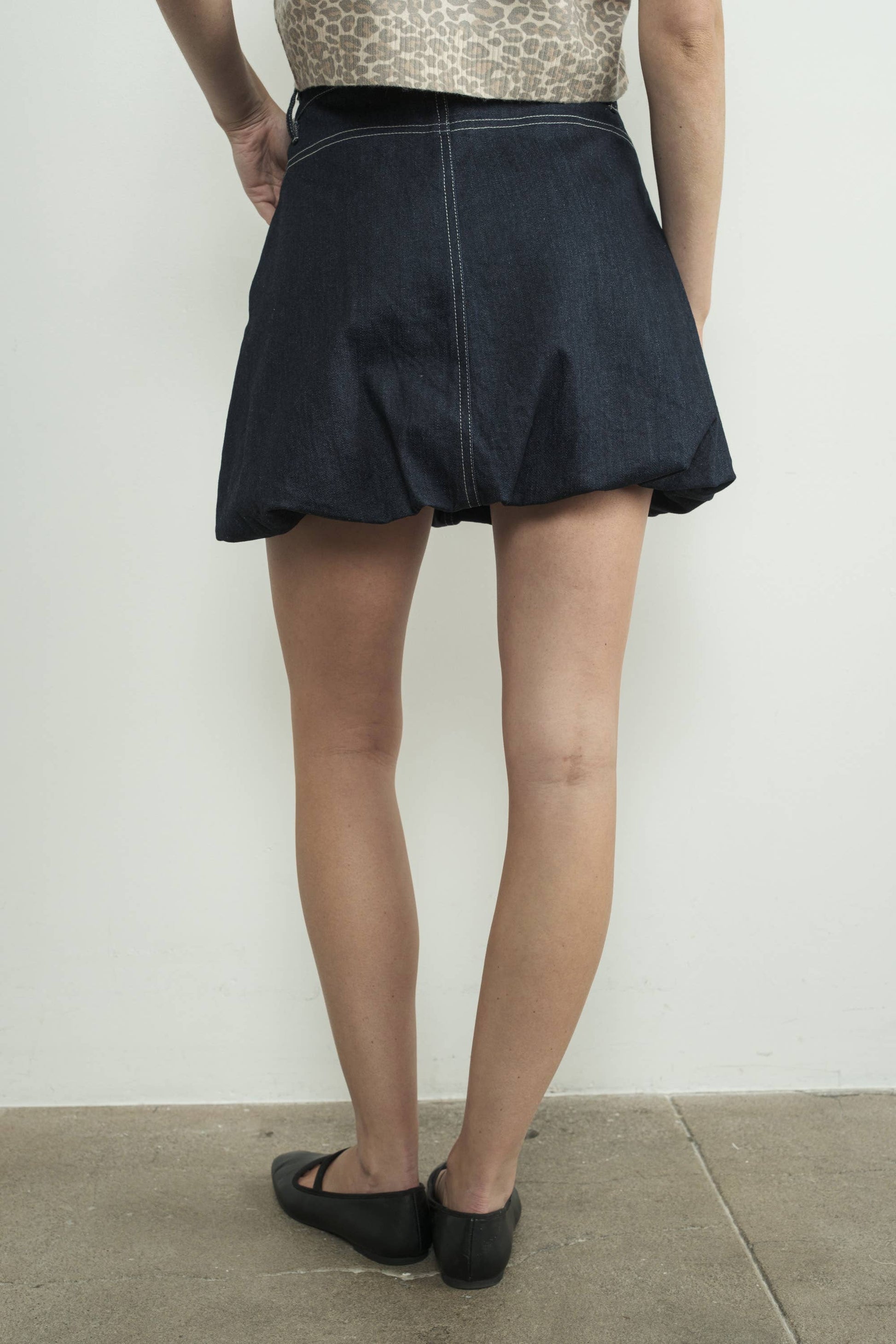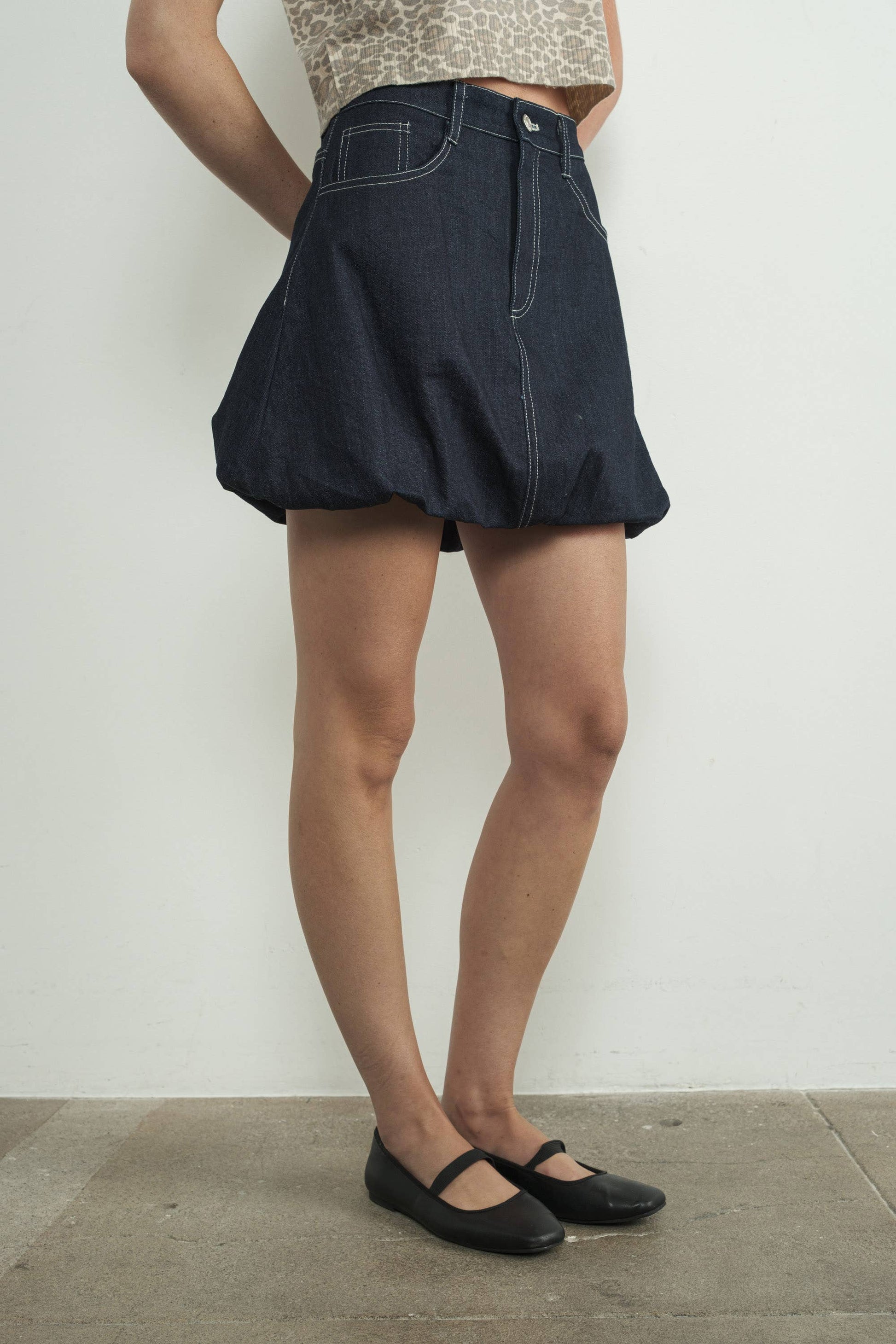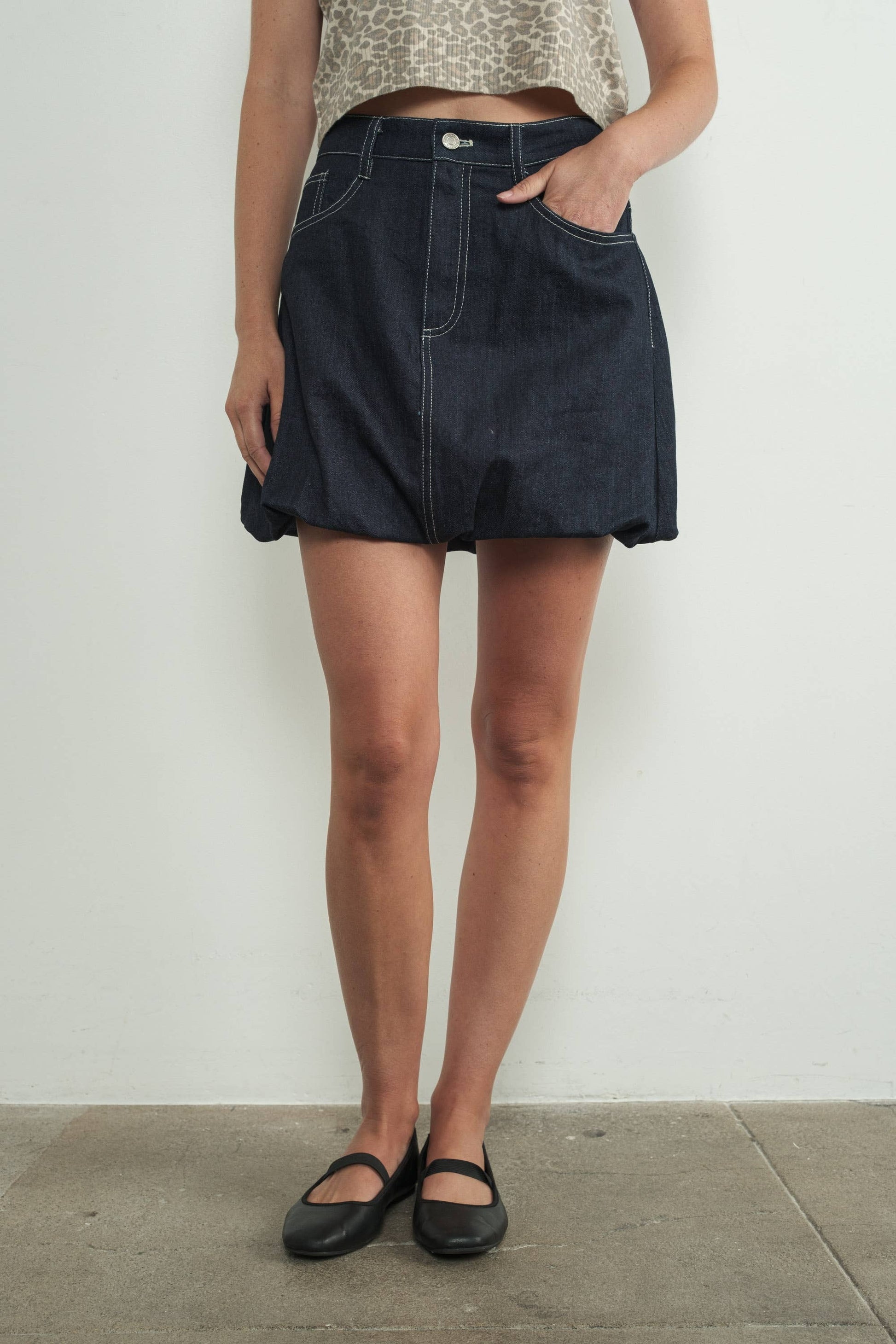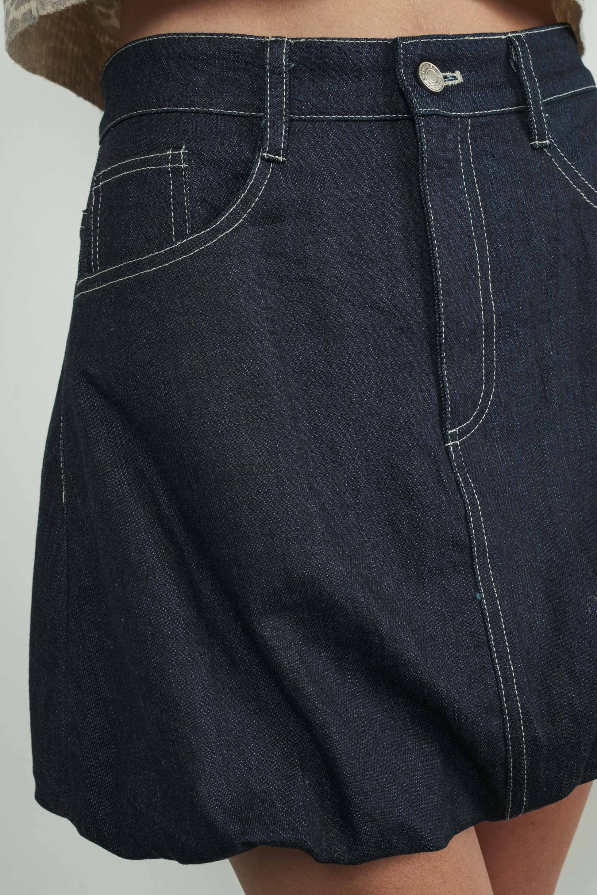 This trendy mini skirts features a relaxed bubble silhouette. The puffy bubble hem has a voluminous cloud-like look. This playful skirts is now trending. adds a touch of classic with denim.