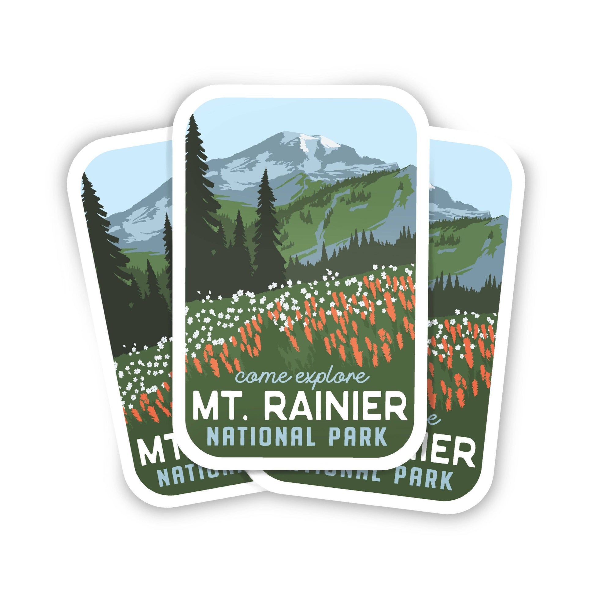 Matte Stickers of the Mount Rainier National Park, Washington Travel Poster Design.