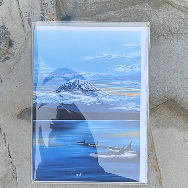 Beautiful art card of the majestic Mount Rainier National park and Orca's "On the Hunt".