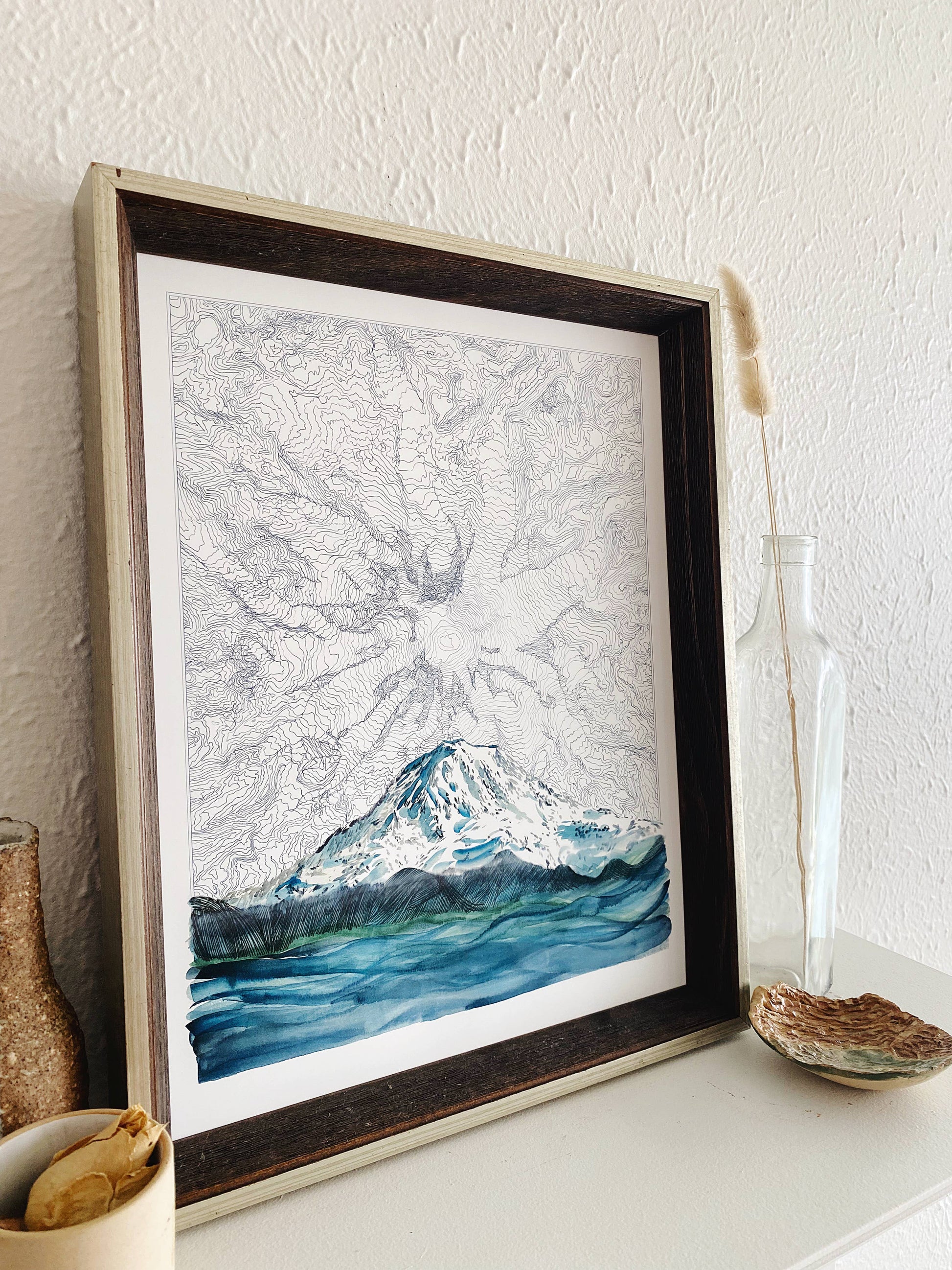 This is a PRINT of my original hand-drawn ink line drawing, merged with my painting of the mountain in deep blues, with a spot of teal on the foothills.