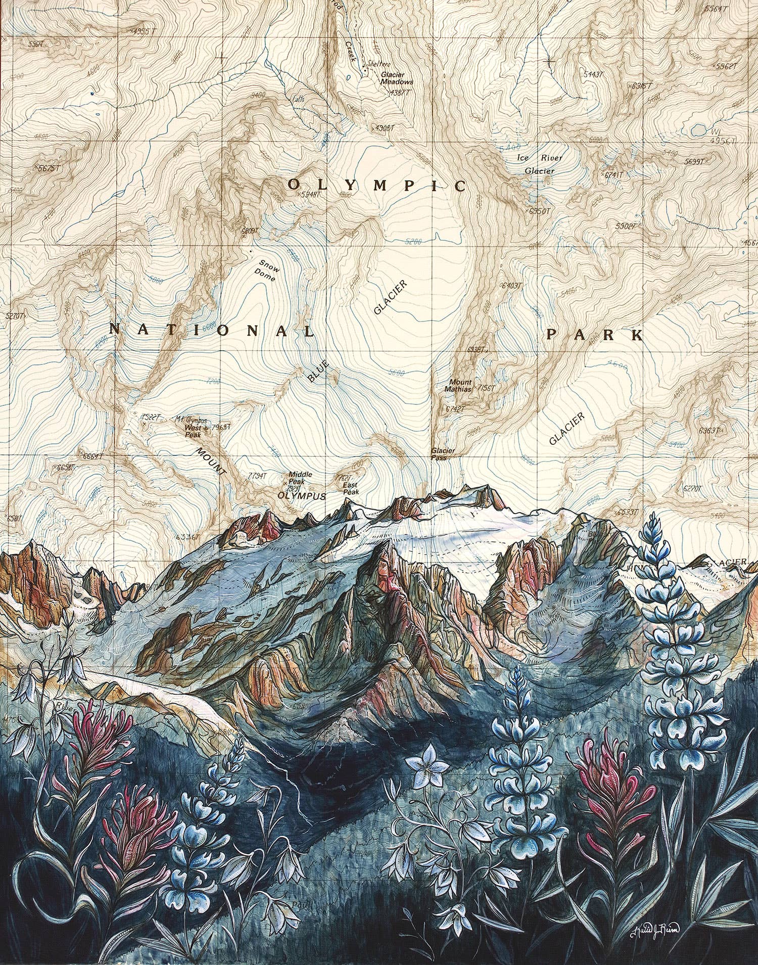 Mt Olympus in Olympic National Park is featured in this painting on a vintage map. Wildflowers frame this epic mountain peak in Washington.