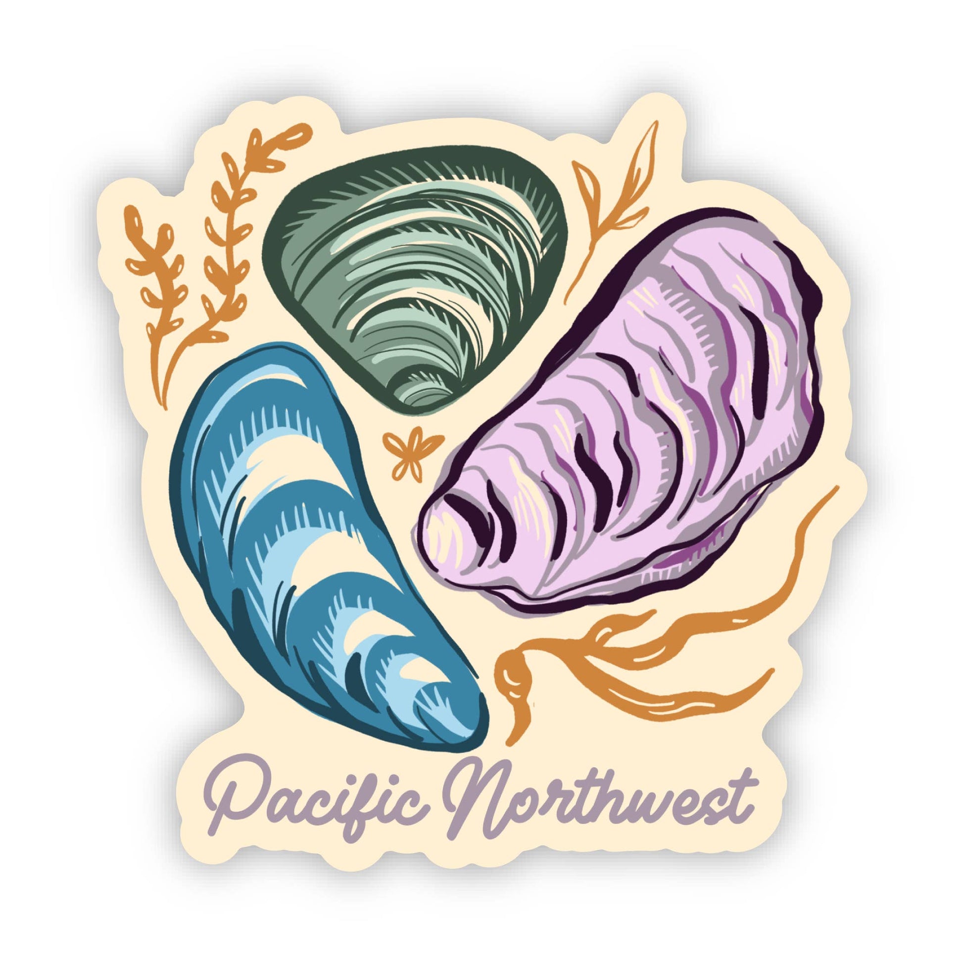 Some favorites fresh from the Puget Sound! A little trio of shellfish in pastel colors are surrounded in decorative seaweeds on a light cream color background. Great product for any Pacific Northwest shop, beach boutique, or seaside market!