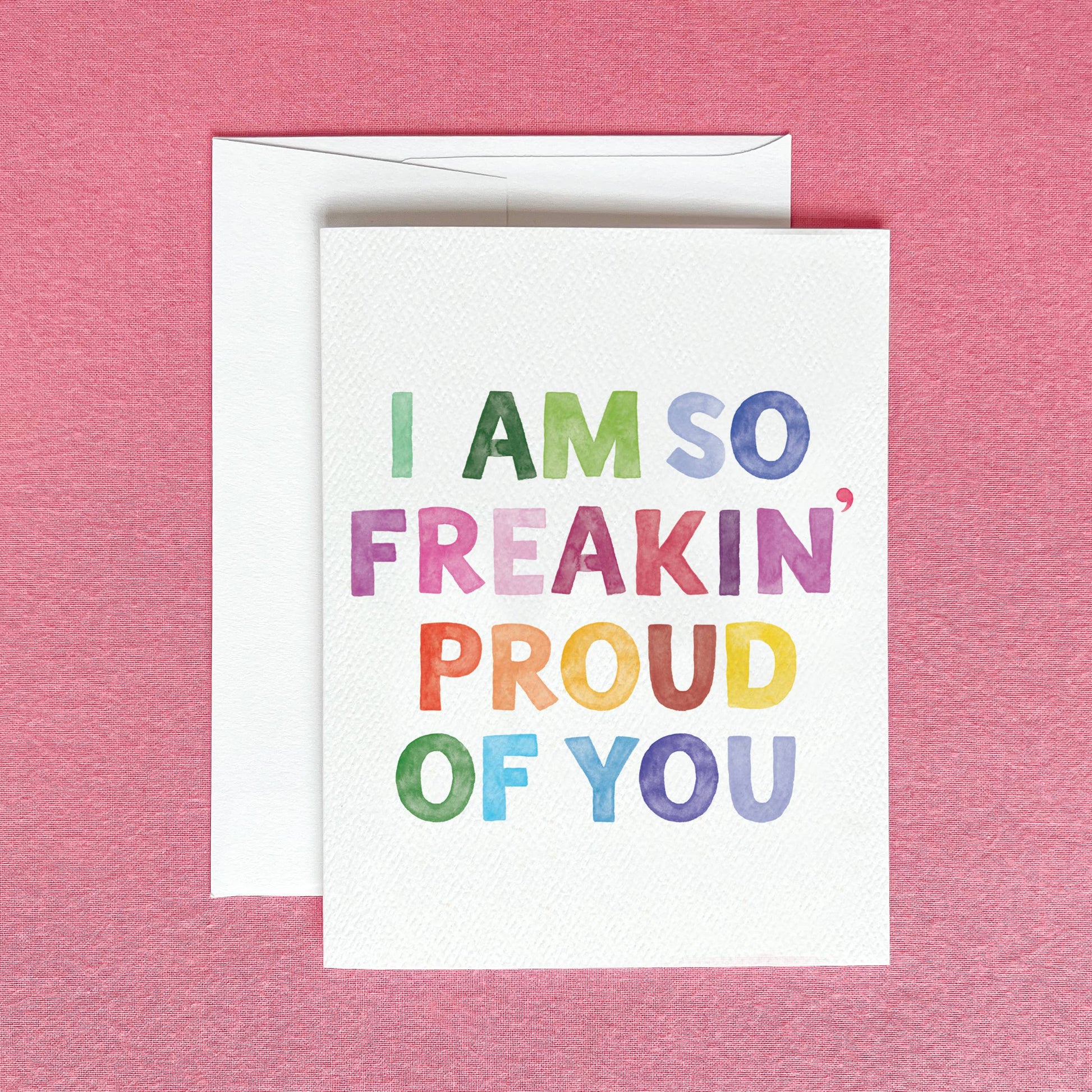 For the moments when “so proud” just isn’t enough. Bold and colorful with the phrase “I’m So Freakin’ Proud of You” in rainbow lettering, it’s a vibrant high-five for anyone who is crushing it! Whether they nailed a milestone or made it through something tough, this card is your cheerful way to say, “You did it—and I see you.”