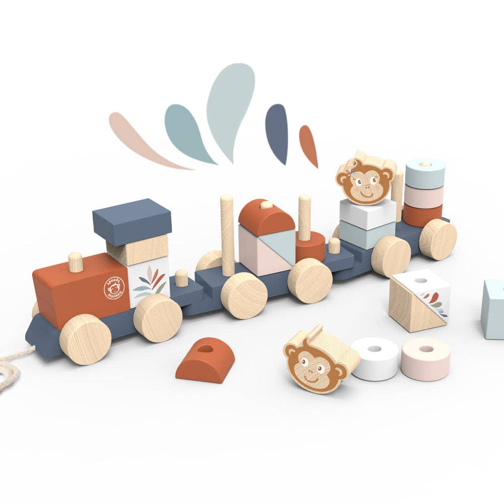 A fun wooden pull-along train stacker, painted in trending soft colors and featuring our favorite character, the monkey.