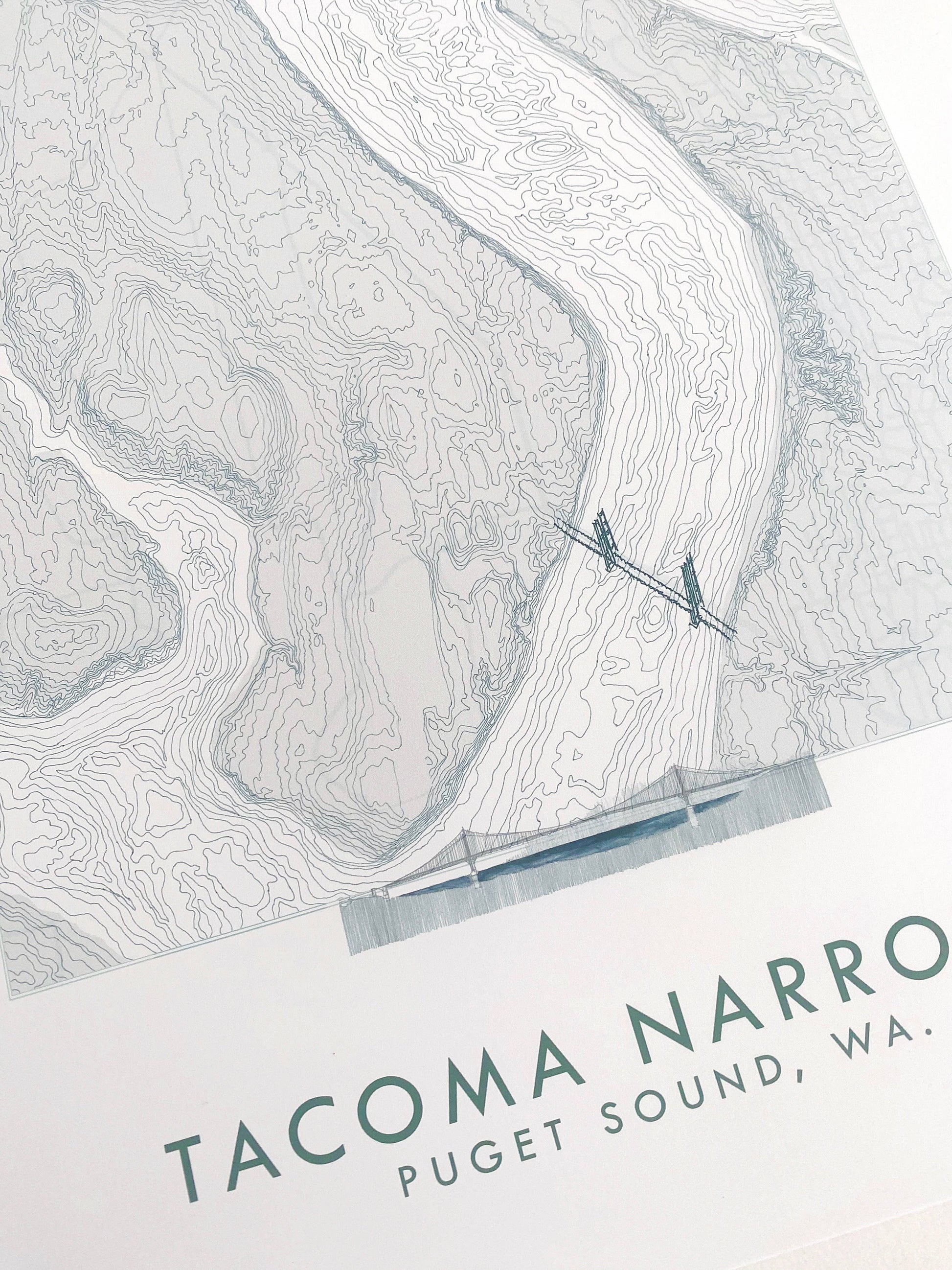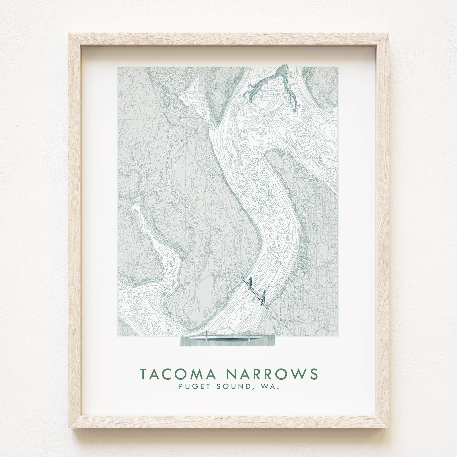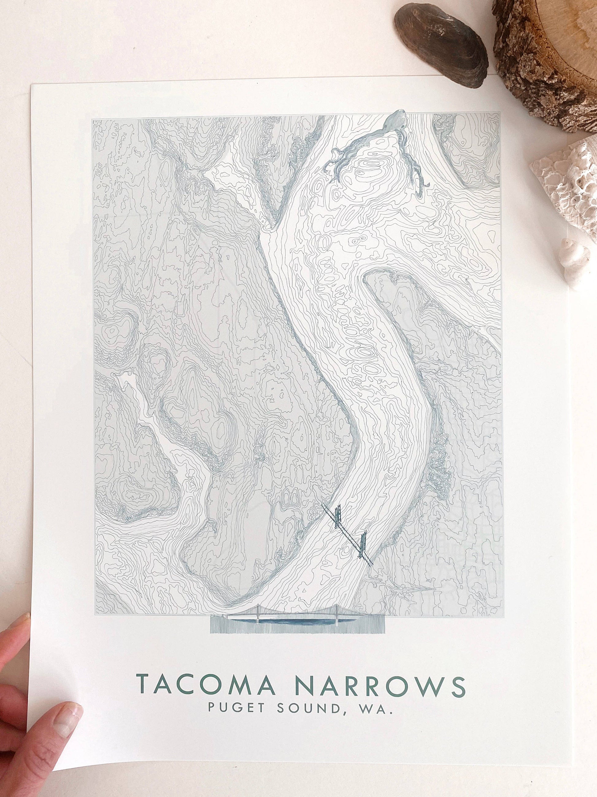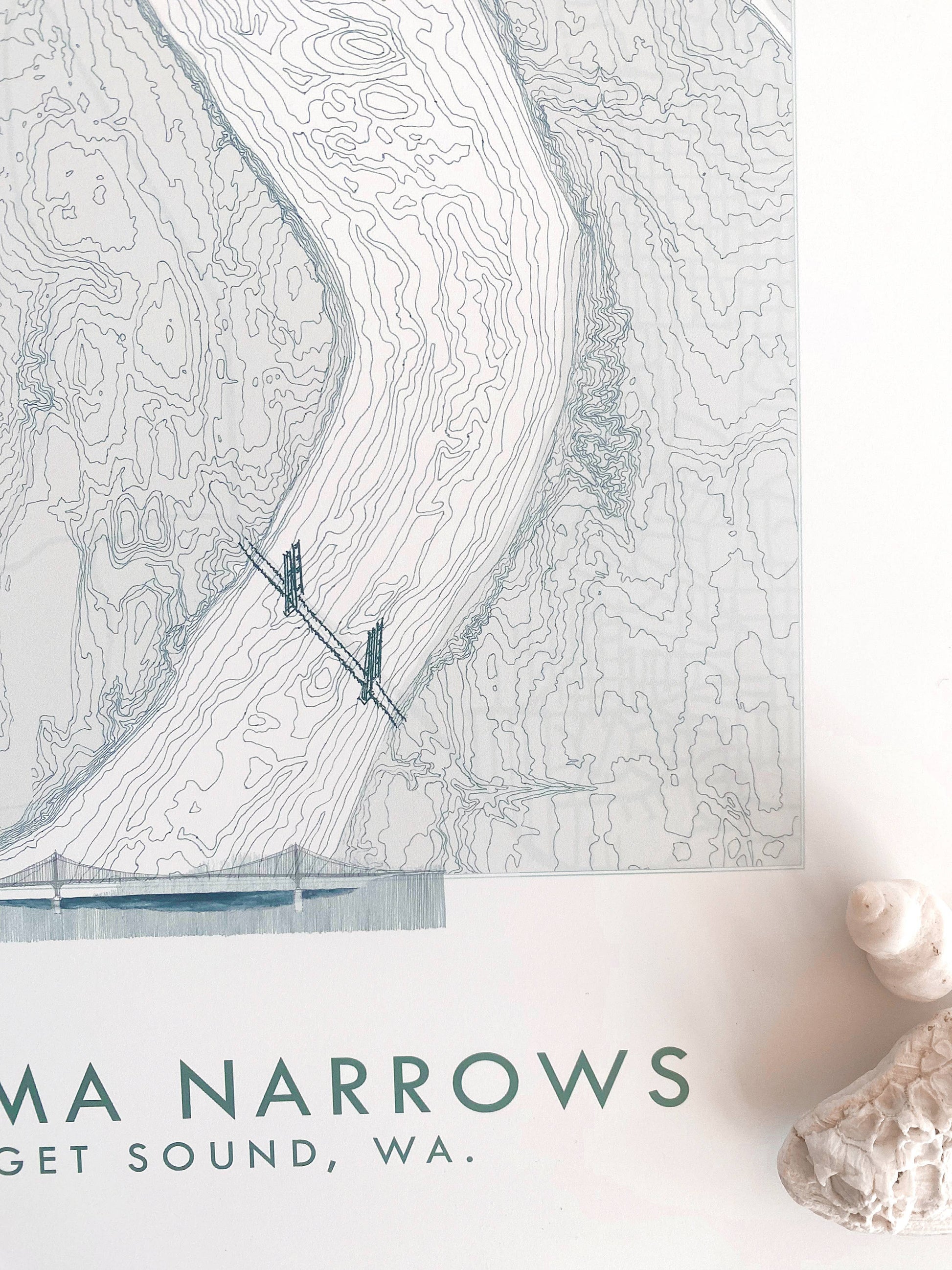 Tacoma NARROWS + Gig Harbor, Washington Hand-drawn Topographical Bathymetric Map Art Prints - Show some local love for your favorite getaway or beloved home!