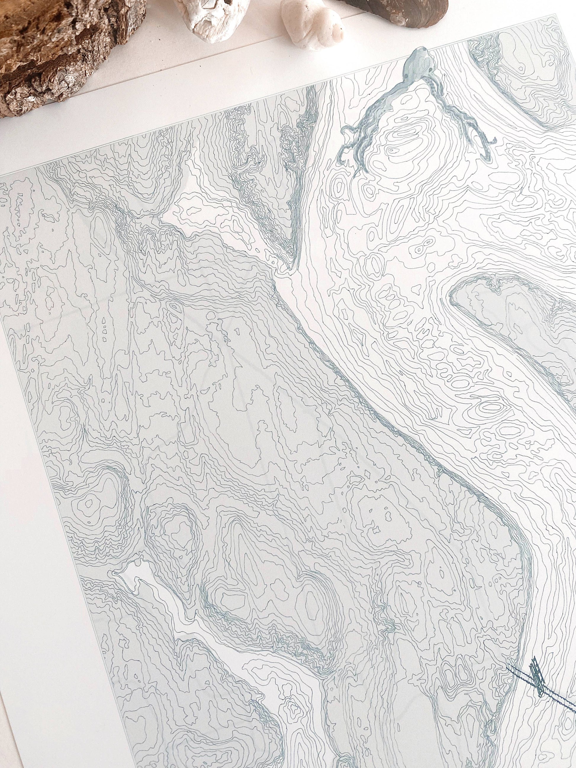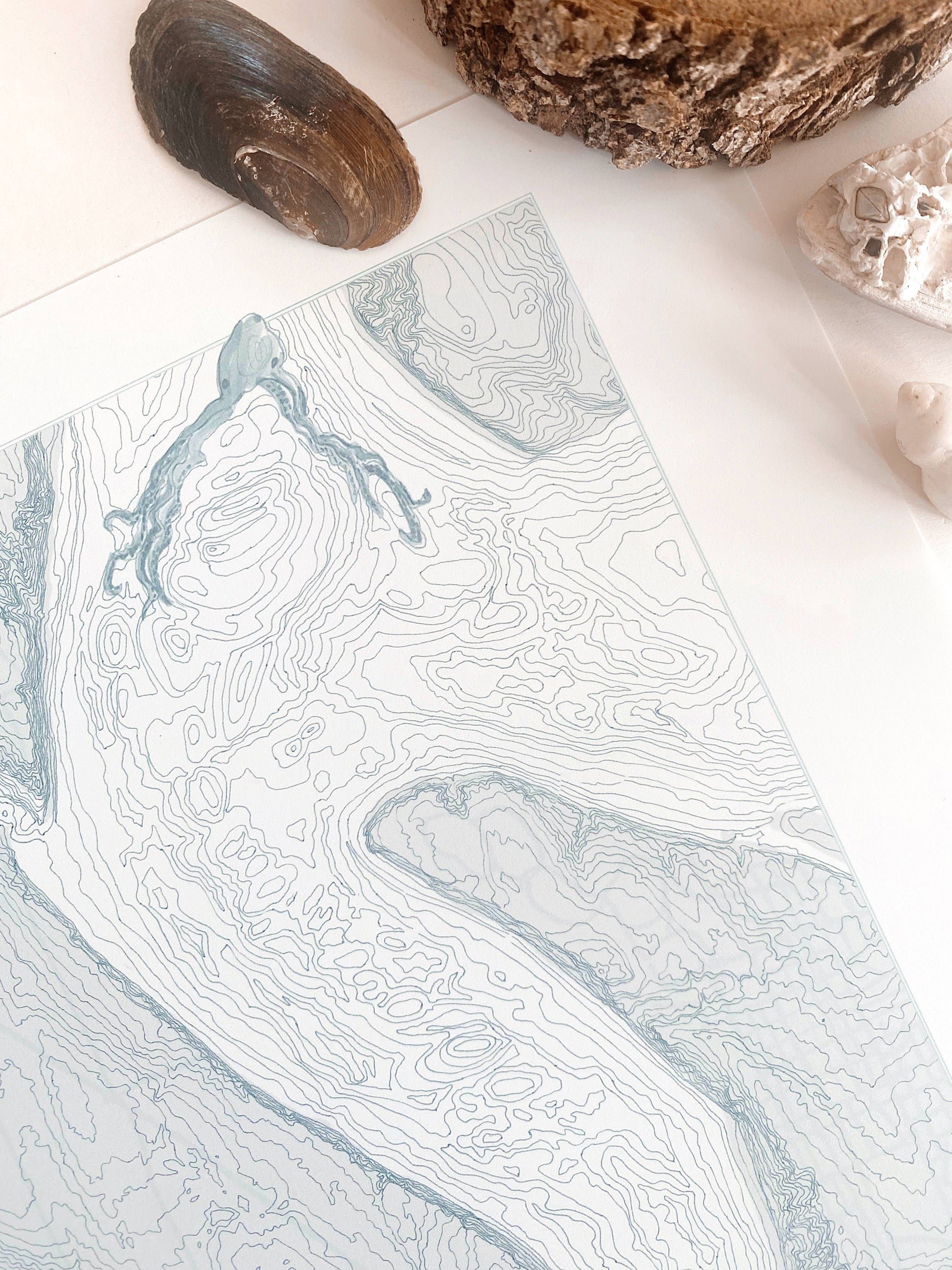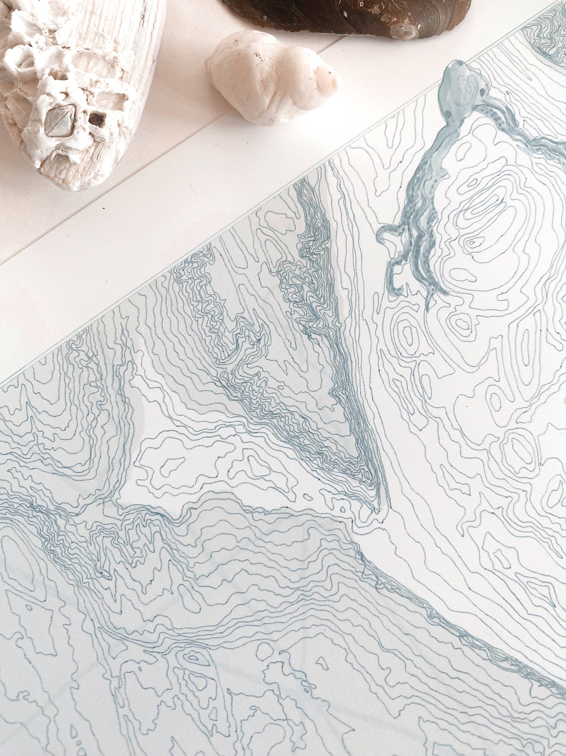 This is a PRINT of my hand-drawn topographic hachures and bathymetric lines in greens to match Maps of: Whidbey, San Juans, South Sound, Vashon, Anacortes...