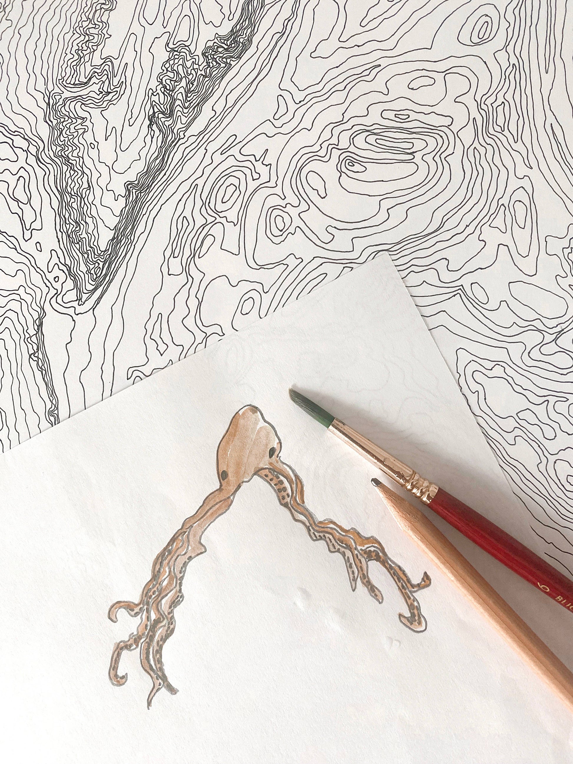 I also sketched the bridge rising within the map, an elevation of the the bridges along the bottom frame and - surprise! - an octopus blending into the bathymetric lines of the Colvos Passage, at the top frame.