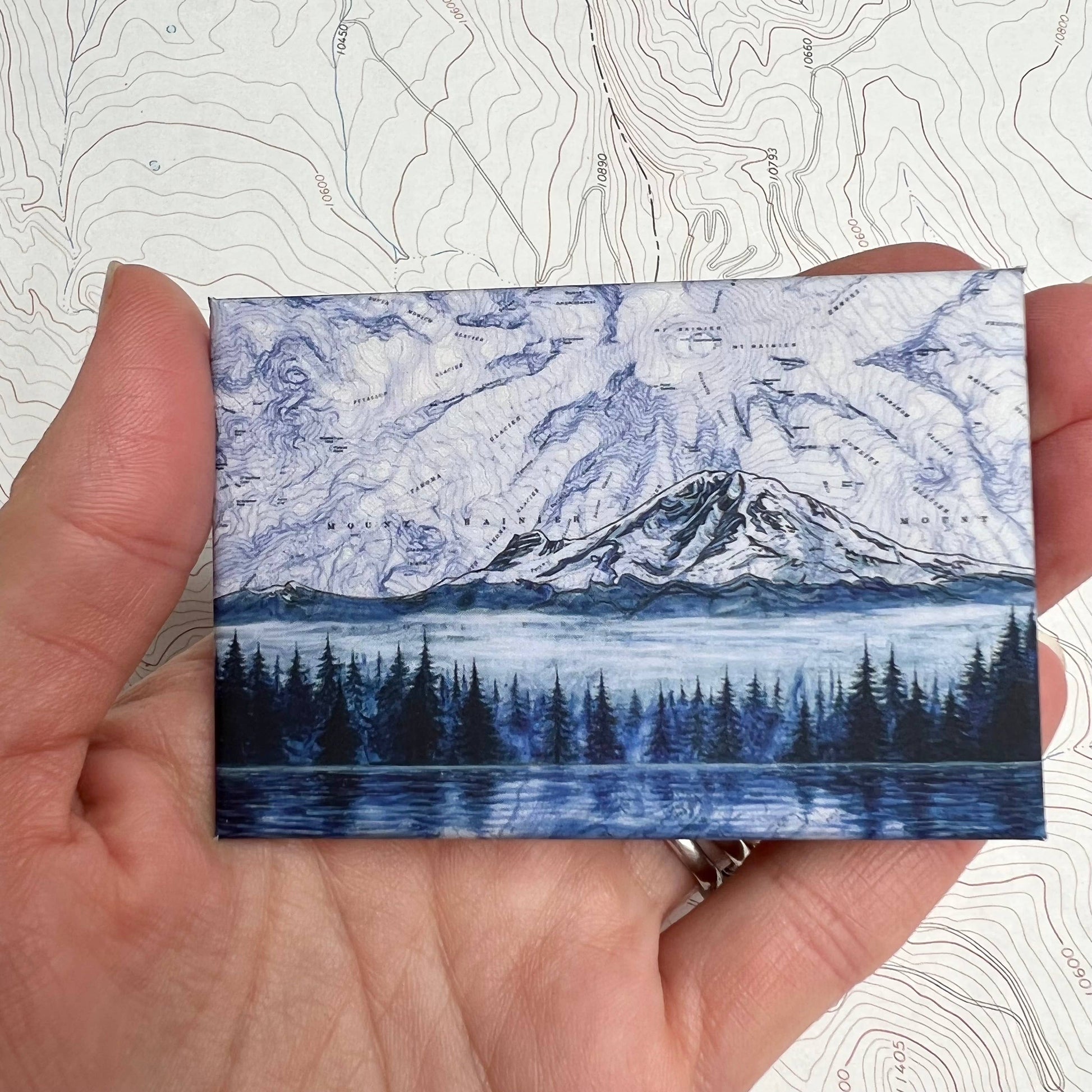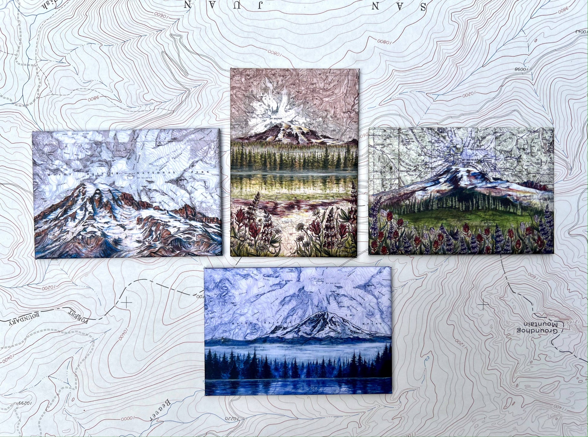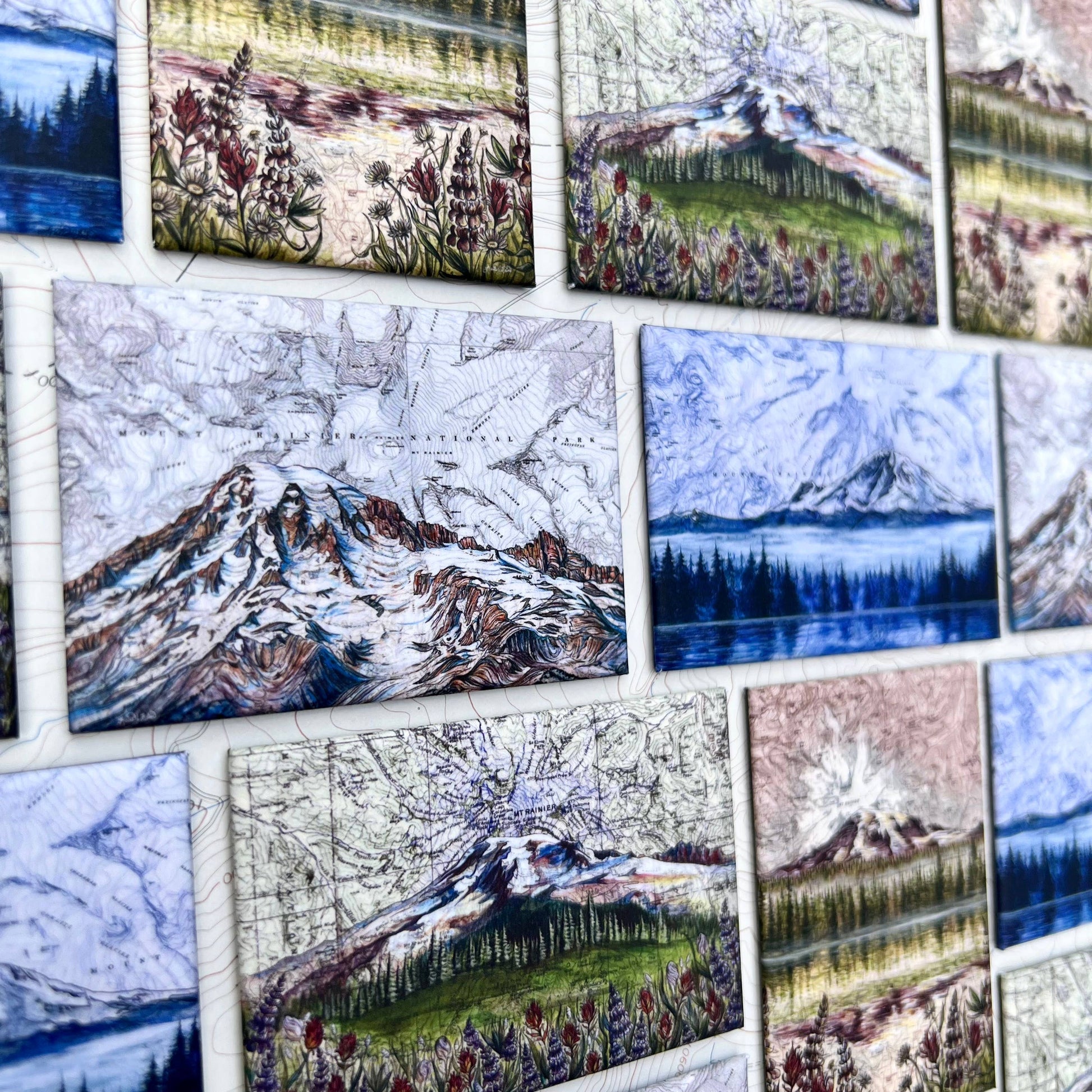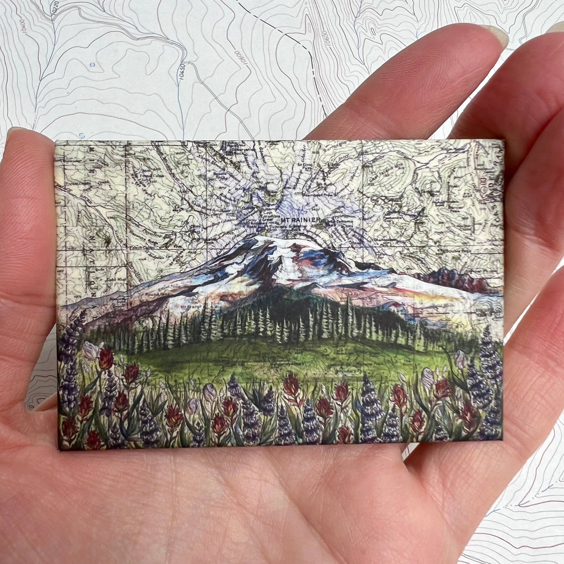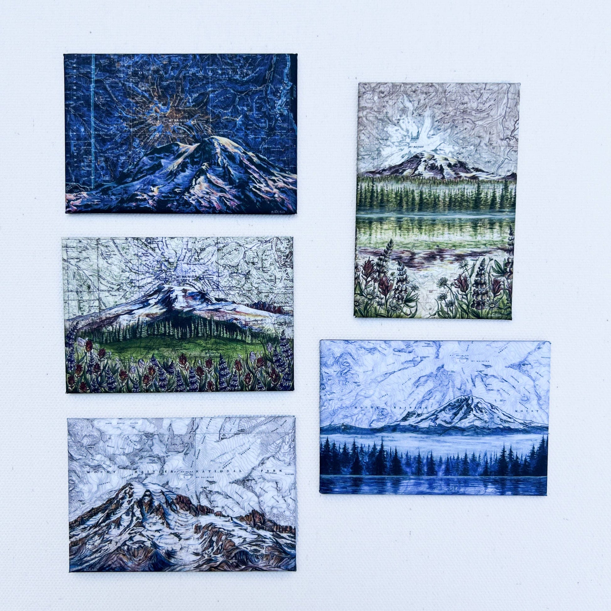 My original paintings of some views of Washington's favorite mountain, Mt Rainier, are featured on these crisply printed rectangular fridge magnets. Great for the WA adventurer and travelers to the PNW.